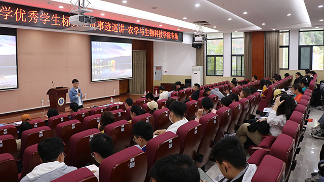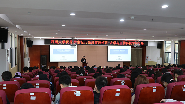 最后是来自蚕桑纺织与生物质科学学院的孙小桐同学,曾任院团委学生会主席、年级长等职位,同样也多次获得奖学金及西南大学优秀学生标兵等荣誉称号。她从热爱、责任和奉献三个方面讲述了这几年她的大学生活所获所得。究其动力,孙小桐告诉同学们,是热爱支撑着自己,通过各种社会实践服务于他人,奉献出自己的专业知识。她享受着这途中给他带来的一切,这都源于她的热爱。