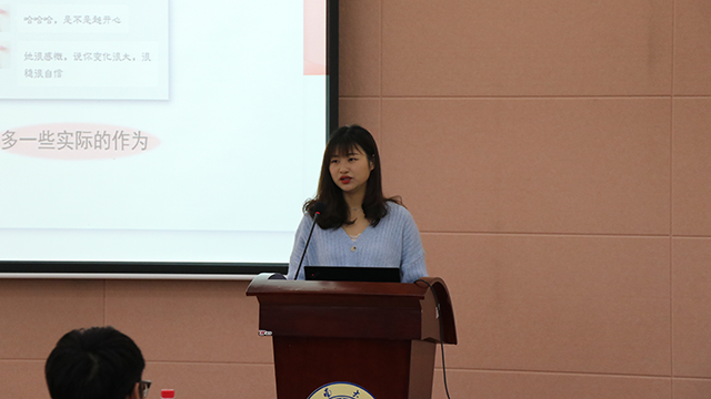 紧接着,来自马克思主义学院的王钰洁同学向同学们讲述了她的故事。从天生缺陷的低估起步,到如今破茧成蝶的蜕变,王钰洁凭借着自己踏实的勤奋努力,多次获奖学金,同时也荣获全国大学生马克思主义理论学习夏令营优秀营员、西南大学优秀学生标兵等荣誉称号。她告诉同学们遇到自己天生的不足,要学会去克服。找到自己路,做好自己的本分工作,一步一步地向前,总能成功。