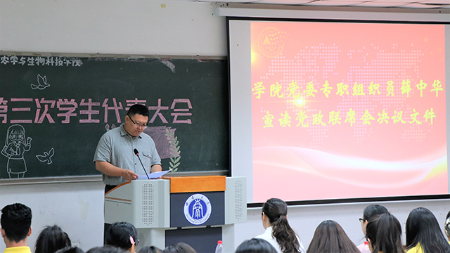 正式会议中,首先由学院党委书记赵子华宣读学院党委批复并讲话。他对筹备大会的老师同学的辛苦付出表示了肯定,并合习近平总书记七年知青岁月的奋斗经历,以及对当前农科365英国在线体育目标,向在座的学生代表们提出了要求并寄予厚望。接着,西南大学学生委员会主席褚锦城宣读了学校学生会对best365英国在线体育官网第三次学生代表大会的批复。