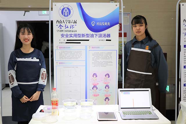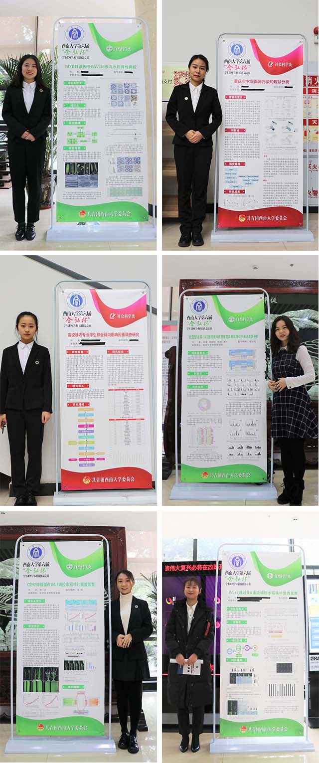 敏学勤思,锐意创新。在本届竞赛中,我院共推荐10项参赛,经过初评,有院刘璞、李一丹、王玲等同学的7个作品入围决赛,包括“甘蓝型油菜CKX基因家族成员鉴定及表达特征与表达差异分析”等4个自然科学类作品,“安全实用的新型油下汲汤器” 1个发明专利类作品和“基于输出系数模型与马尔科夫链的重庆市农业面源污染的现状分析” 2个社会科学类作品。赛前,各作品团队均做了详尽的准备,现场展示环节的生动讲解、评委问辩环节的从容应答均展示了我院学子的良好的创新能力和精神风貌。此外,学院还组织了低年级同学到现场观摩学习,同学们纷纷表示受益良多。