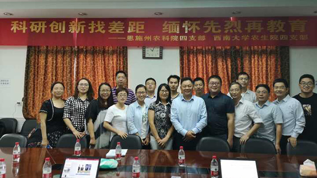 为继承和发扬党的光荣传统和优良作风,进一步深入开展革命传统教育和爱国主义教育,增强支部凝聚力和战斗力,引导党员干部增强党性观念,激发工作热情,发挥党员先锋模范作用。并以此为契机,把科研工作与支部建设相结合,实现党建工作和业务工作两手抓的良好态势,恩施州农科院第四支部一行15名党员到我院与教工第四支部进行深层交流和合作,特此开展“科研创新找差距 缅怀先烈再教育”的特色活动。活动分座谈会和参观试验基地两部分进行。