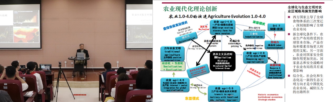 温铁军教授就中国农业发展历史和未来出路问题作《农业4.0及乡村振兴》专题报告,指出我们要转变观念,逐步摒弃从过去激进的追求工业化和追求城市化,以为这就是现代化的全部内涵的观念,转变为把生态文明作为发展的方向。温教授以此为思想指导,梳理了农业发展的4个时代:农业1.0模式是典型是殖民模式,形成大农场,规模化生产,但这一套肯定会造成严重的生态环境破坏的;2.0版是所谓的“工厂化改造”,愚昧的人类改造自然的方式,隔绝自然作物与生物种群的关系;3.0版,农业类四大跨国公司,以巨额资本在股票市场、期货市场等结合,从事的不是第一产业,而是三产;而中国要发展的农业现代化一定是社会生态农业的现代化,就是农业4.0版本。