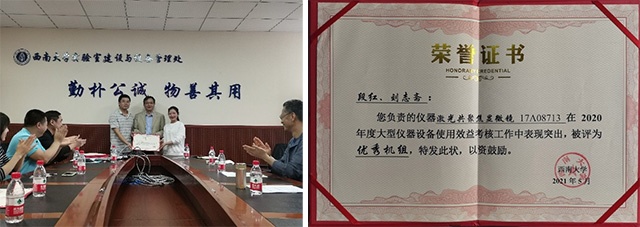 此次座谈会共计表彰了全校范围内的4个优秀单位和8个优秀机组,我院由段红和刘志斋共同管理的“激光共聚焦显微镜”机组获评“优秀机组”。统计数据显示,该仪器自2018年进入学校大型仪器共享网络预约使用以来,严格按照大型共享仪器的要求进行管理,累计为全校近10个学院和研究所室、中心提供服务,取得了良好的效益。