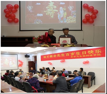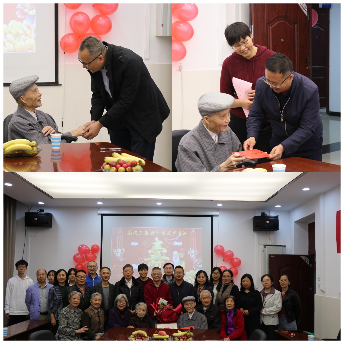 我院退休教师王康老先生迎来了他的百岁寿辰,依照重庆习俗,学院为老先生策划了这场别开生面的百岁寿辰茶话会。学院领导及在职、退休教师代表和王康老师的好友同事们参加了茶话会,共同祝福王康老师生日快乐,福寿安康!院老协小组长孙泽江老师献上鲜花及祝福,教研组同事吴珍龄老师献上自己创作的“双寿”图表示祝贺。王三根老师作为王康老师的学生代表向大家讲述了老先生在教育科研工作上无私奉献、与时俱进,敢为人先的精神。