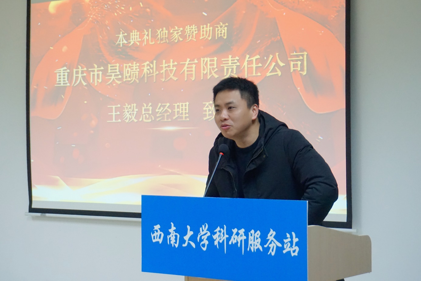颁奖典礼第四项,由本次颁奖典礼赞助商代表王毅总经理致辞。王总经理表示,每位研究生都有若干学术问题需要解决,这其中难免会遇到比较棘手的问题,问题堆在那里会徒增烦恼,这就需要一个良性循环的解决方案,而服务站的科研帮扶体系就是最佳解决方案。王总经理还提到,自己从服务站刚组建时就已经开始关注服务站的各项动态了,他被服务站超高工作效率所吸引,同时也为服务站志愿者们的坚持和奉献所感动。作为一家科研服务企业的负责人,也应该学习服务站的建站精神,在保证自身持续运营的基础上,不断提高企业科研服务的专业实力,勇敢担起社会责任,向更多有困难的群体伸出援助之手。