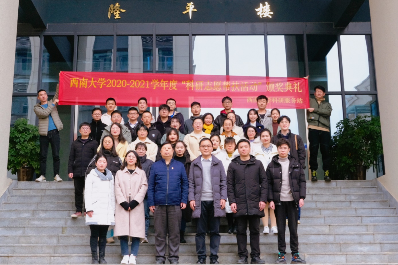 颁奖典礼第二项,由阳书记、柴友荣老师、庞丹老师和段红老师分别为西南大学2020-2021学年度科研志愿帮扶活动“科研服务标兵”、“科研服务最佳贡献者”、“科研服务特殊贡献者”、“科研服务先进个人”以及“科研服务优秀个人”等荣誉称号获得者颁发校级荣誉证书及丰厚奖品,并合影留念。其中,员菡博士获得本次颁奖典礼最高奖项“科研服务标兵”荣誉称号,委刚、琚熙三两位同学获得“科研服务最佳贡献者”荣誉称号,王宁朝、俞晓峰两位同学获得“科研服务特殊贡献者”荣誉称号,张莹莹、杨宏霞、张帅、张媛四位同学获得“科研服务先进个人”荣誉称号,刘铭、游静、张乾微、钱明超、杨博、张秋丽、周清颖、戴继超八位同学获得“科研服务优秀个人”荣誉称号。