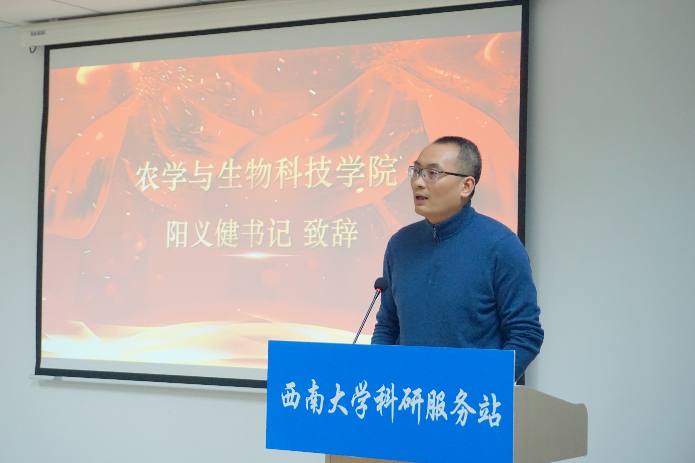 颁奖典礼第一项,由农生院党委书记阳义健老师作颁奖典礼开幕致辞。阳书记首先对服务站的建设成果表示高度肯定。阳书记指出,服务站将党建与科研帮扶有机融合,在较短的时间里创新性完成了服务站的组建以及规范化的科研帮扶制度建设,行动迅速且成效显著,具有很强的引领示范作用。随后,阳书记为服务站后期建设提出三点中肯建议,一是要进一步规范运行流程,以确保服务站的长期稳定运营;二是要不断扩大服务站的影响力,争取为全校师生提供高质量的科研帮扶;三是树立帮扶者典范,收集受助者典型案例,持续宣传帮扶者的模范事迹。最后,阳书记对各位获奖同学表示衷心祝贺,并寄语获奖同学和全体服务站成员们要珍惜现有成果,不忘初心,戒骄戒躁,力争取得更加优异的成绩。