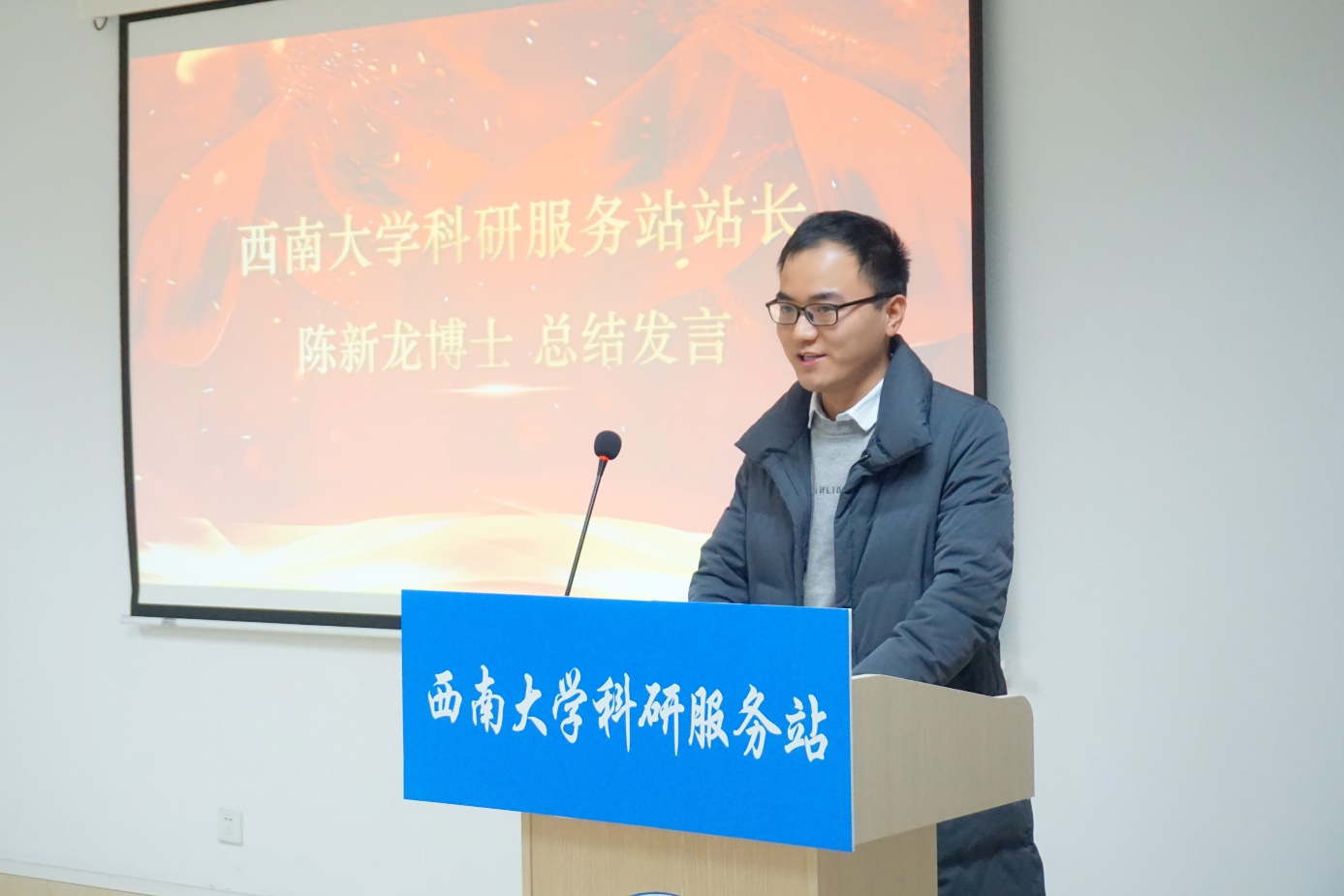 在颁奖典礼的最后,由西南大学科研服务站站长陈新龙博士作总结发言。陈站长首先代表服务站对学校、学院和各界的支持表示衷心感谢,对获奖同学表示热烈祝贺。随后,陈站长对服务站走过的点点滴滴进行了概括性总结。陈站长感慨道,自组建以来,服务站经历过各种挫折,遇到过不计其数的困难,也有接二连三的问题需要解决,但服务站志愿者们从未退缩,无论是线下科研帮扶,还是线上科研帮扶,服务站始终秉承科技报国初心,担当科研帮扶使命,竭尽全力帮助每一位向服务站求助的科研学子解决科研困惑,在2020-2021学年度累计向学校近2000名同学提供科研志愿帮扶,创造了“科研困惑有求必应”、“援助成功率高达96%”的骄人成绩,这些成绩离不开服务站志愿者们的齐心协力,更离不开一直默默支持服务站工作的老师和同学们。最后,陈站长呼吁更多同学加入到服务站的建设中来,为打造立足学术、开放共享的学生科研互助平台贡献自己的一份力量。