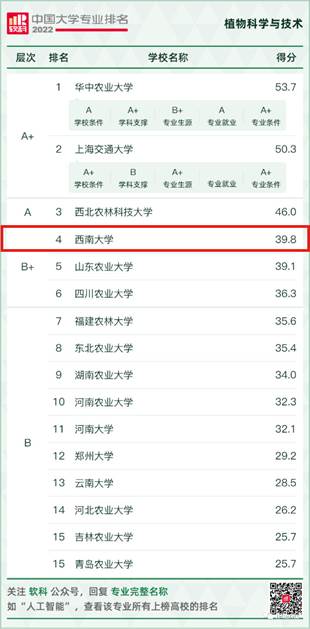 6月18日,高等教育专业评价机构软科正式发布2022“软科中国大学专业排名”。在植物科学与技术专业排名中,共有16所高校上榜,我校位列第4,位居B+层次高校的第一名!