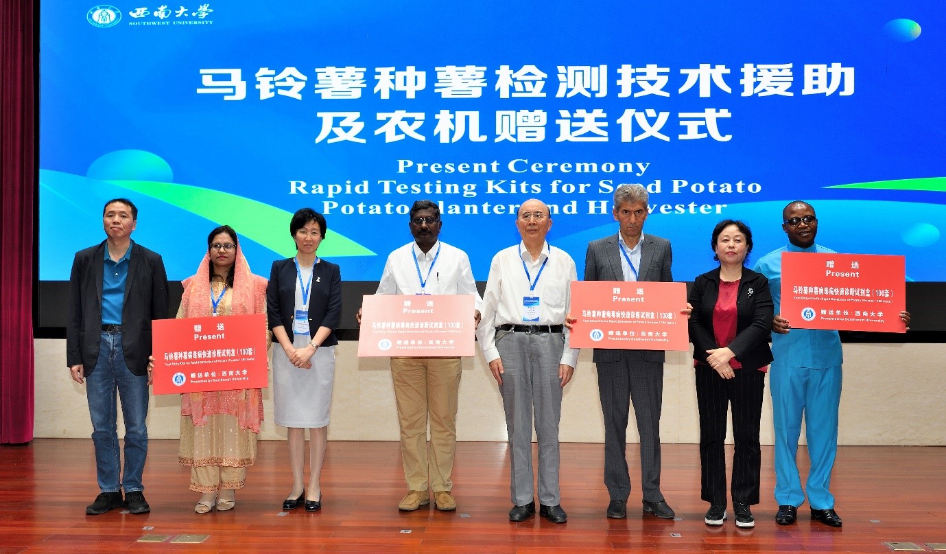 5月25日上午,在西南大学东方红会议厅举行大会开幕式。王进军代表学校对国家和市级行业部门领导与各国各地区同行专家的到来表示欢迎,报告了学校“一带一路”国际合作和种质资源创制取得的丰硕成果以及对未来发展的展望。Vadim Khassanov教授代表校方致辞,Philip James Kear博士代表国际马铃薯中心致辞。随后,农业农村部人力资源开发中心李厥桐副处长致辞并宣读“一带一路”国际马铃薯产业科技创新院建设批复文件。各方代表就“一带一路”国际马铃薯产业科技创新院建设进行合作签约,并共同发布“一带一路”国际马铃薯种质资源库共建共享倡议书。我方代表向“一带一路” 国际马铃薯产业创新研究院共建国家代表赠送马铃病毒病快速检测试剂盒1000套以及马铃薯种植、收获农机各1台。