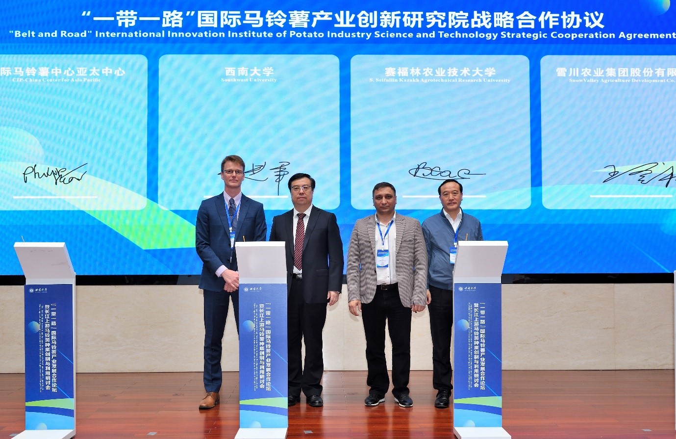 中国科学技术交流中心副主任庄嘉、西南大学党委常委、副校长王进军、农业农村部人力资源开发中心副处长李厥桐等出席仪式并致辞,王进军、中国种子协会马铃薯分会会长王登社、国际马铃薯中心亚太中心国家联络科学家Philip James Kear博士、哈萨克斯坦塞弗林农业科技大学Vadim Khassanov教授代表各方签署合作协议;国家马铃薯产业体系首席科学家金黎平研究员、国际马铃薯中心育种部主任Hannele Lindqvist-Kreuze博士等人进行了倡议书发布。重庆市农业农村委员会二级巡视员周敏、中国科学技术交流中心欧亚处负责人万聪、中国西部(重庆)科学城种质创制大科学中心首席科学家夏庆友教授、中国种子协会原副会长兼秘书长李立秋等出席见证。