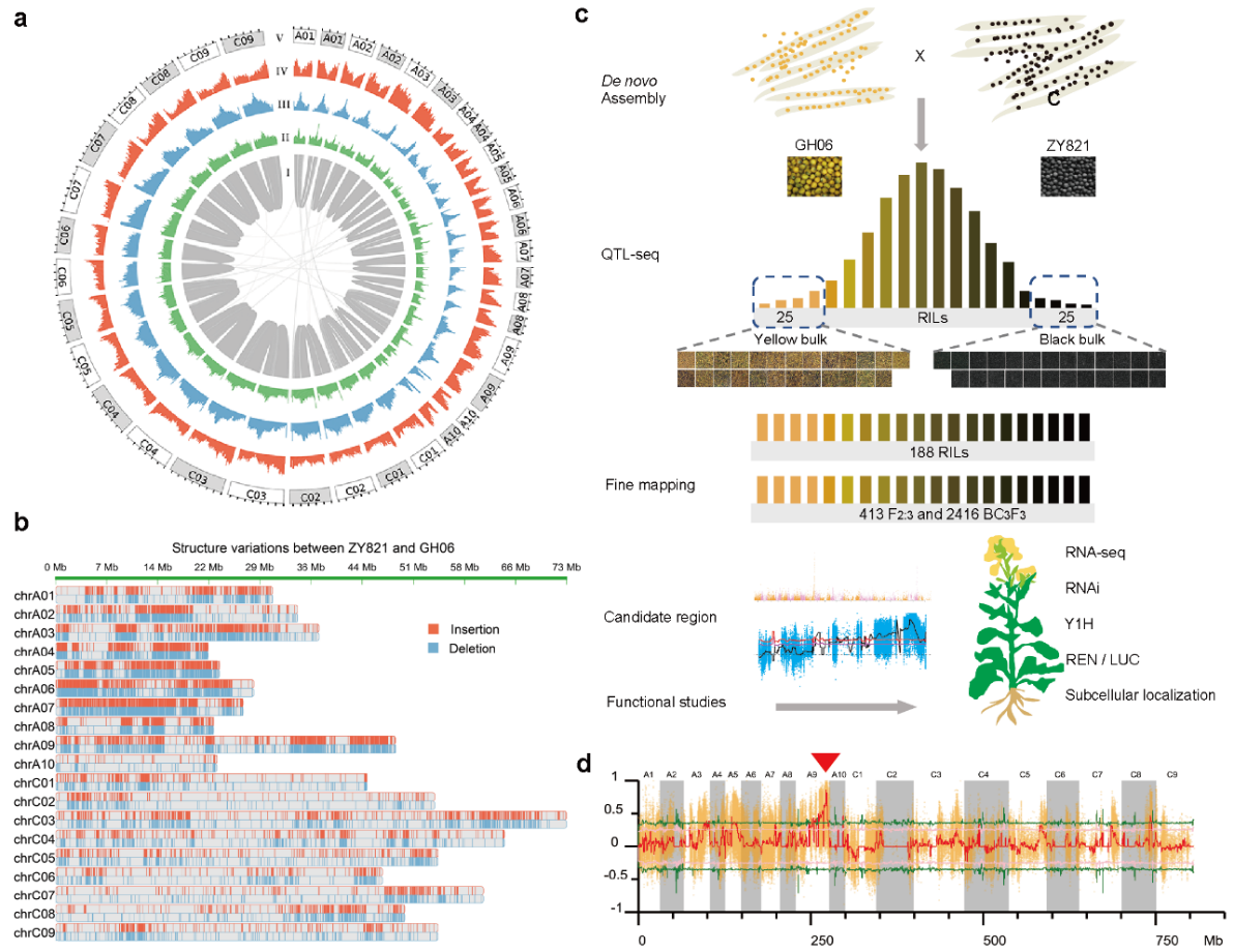 研究通过二代(Illumina)和三代(PacBio)基因组测序,结合Hi-C技术辅助组装,获得甘蓝型油菜黄籽GH06和黑籽ZY821高质量基因组图谱,组装的基因组大小分别为846.29 Mbp和863.16 Mbp,contig N50分别为3.65 Mb和3.64 Mbp,约有94.04%和93.34%的基因组序列被挂载在19条染色体上,将GH06基因组和中油821基因组比对分析,共检测到了18,505个结构变异,包括10,208个插入和8,297个缺失,其中A亚基因组比C亚基因组表现出更多的变异,这表明A亚基因组在油菜进化过程中经历了更多的基因重组事件。在对粒色性状传统QTL定位基础上,结合QTL-seq、基因组、转录组等多组学分析,发现编码R2R3-MYB型转录因子的BnA09MYB47a是控制黄籽性状的主要候选基因(图1)。