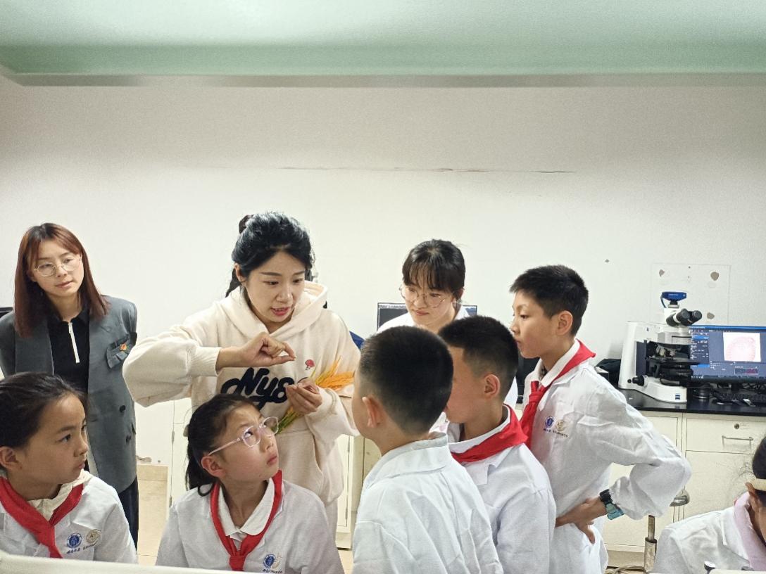 在座谈会的同时,学院张媞老师在37-407会议室为隆平小学的十名学生开设了一堂题为“为农业插上‘智慧’的翅膀”的科普讲座,用生动有趣的方式为孩子们展开了一幅现代科技赋能农业生产的美丽画卷。随后,教师第一党支部书记张婷老师带领孩子们参观学习了37教一楼的袁隆平事迹展,为他们讲述了袁隆平院士的成长故事和杰出成就,鼓励他们向袁隆平院士学习,用知识和汗水为我国的农业事业作出更多的贡献。