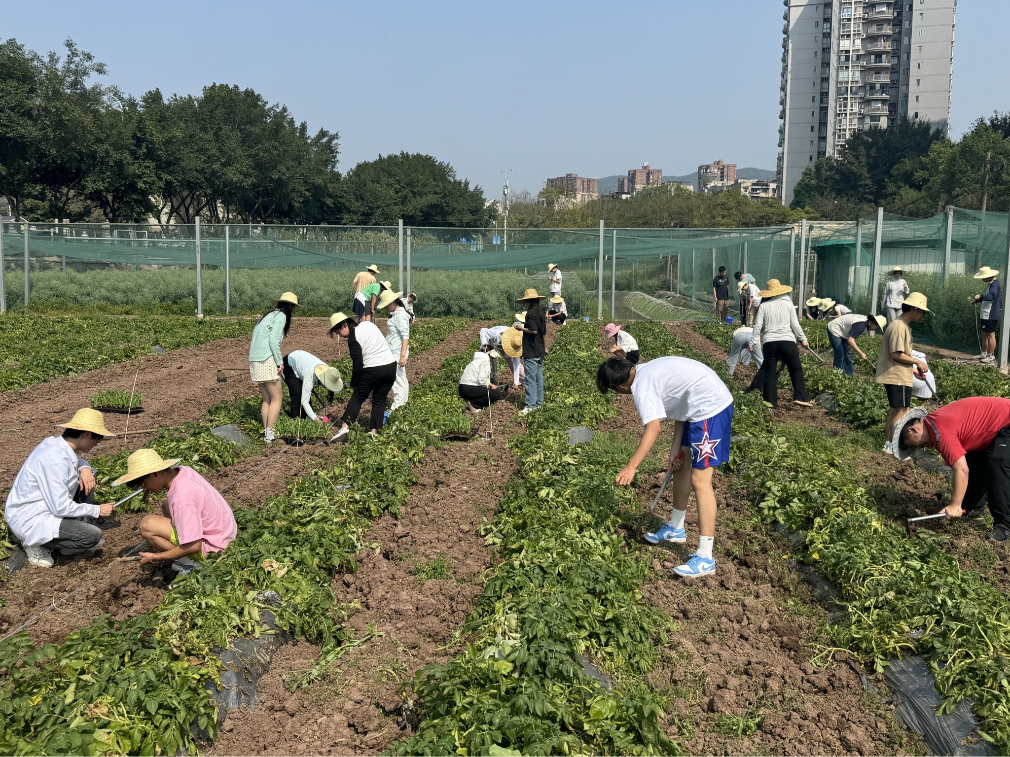 随后,同学们严格按照流程操作,开始了玉米苗移栽工作。转苗、称肥、空间配置、打窝、起苗、栽苗、施肥……大家手握锄头,躬耕田间,每一个步骤都一丝不苟,环环相扣,确保每一株玉米苗都能顺利成活。同学们分工明确,互相协作,现场一片热火朝天的景象。