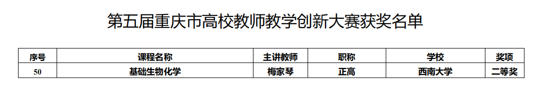 在第五届重庆市高校教师教学创新大赛中,我院梅家琴教授代表 “基础生物化学”课程团队参赛并斩获二等奖。该赛事是经教育部批准的唯一纳入《教育部直属单位三评一竞赛保留项目清单》的高校教师教学竞赛。此次获奖是我院教师首次在市级教学比赛中获得奖项,实现了零的突破,充分展现了我院教师在教学创新方面的实力和潜力,也体现了我院在推动教育教学改革方面取得的积极成效。