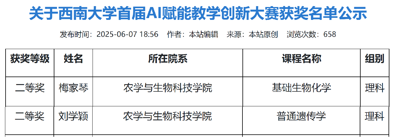 在6月7日举行的西南大学首届 AI 赋能教学创新大赛中,理科组共决出一等奖1项、二等奖3项、三等奖6项,我院梅家琴教授代表的“基础生物化学”课程团队、刘学颖代表的“普通遗传学”课程团队,双双斩获理科组二等奖。两个团队积极探索 AI 技术与教学的深度融合,将 AI 技术引入教学过程,使复杂抽象的学科知识变得直观易懂,有效提升了学生的学习兴趣和实践能力。这一成绩的取得,充分展现了我院教师在教育数字化转型中的积极探索和实践成果,为学院进一步深化教育教学改革、提升教学质量提供了新的思路和方向。