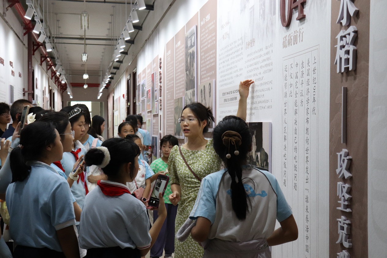 首先,师生们参观了位于37教的袁隆平院士事迹展,学院优秀青年教师张婷讲述了袁隆平院士攻坚克难的生平以及科研事迹,她强调了袁院士"把论文写在祖国大地上"的科学精神,激发了小同学们学农爱农读农的热情和梦想。参观结束后,全体师生前往袁隆平院士雕像处,深切缅怀袁隆平院士。