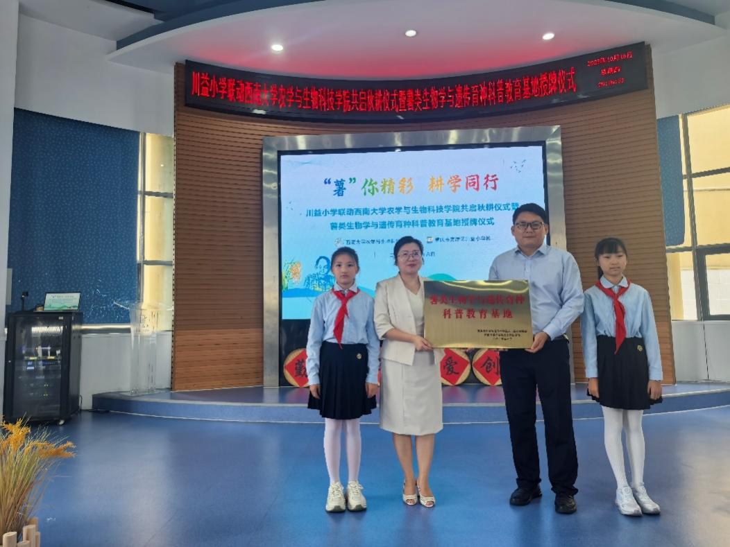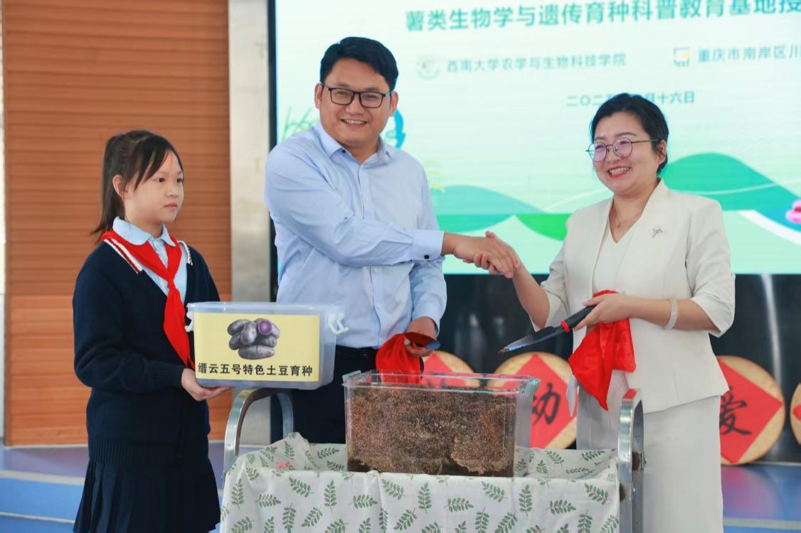 为深入贯彻落实国家关于全面加强新时代大中小学劳动教育的精神,推动“双减”政策走实走深,2025年10月16日,学院与川益小学联合举办的以“耕读传家,薪火相传”主题的秋耕实践暨薯类生物学与遗传育种科普教育基地授牌仪式在南岸区川益小学举行。学院博士生导师、重庆市薯类生物学与遗传育种重庆市重点实验室副主任、重庆市农业农村委现代农业产业技术体系薯类创新团队岗位科学家刘勋教授,蒋锐博士,西南大学(重庆市)农学基础实验教学示范中心副主任赵勇以及川益小学的董宏燕校长等师生代表共同参与本次活动。