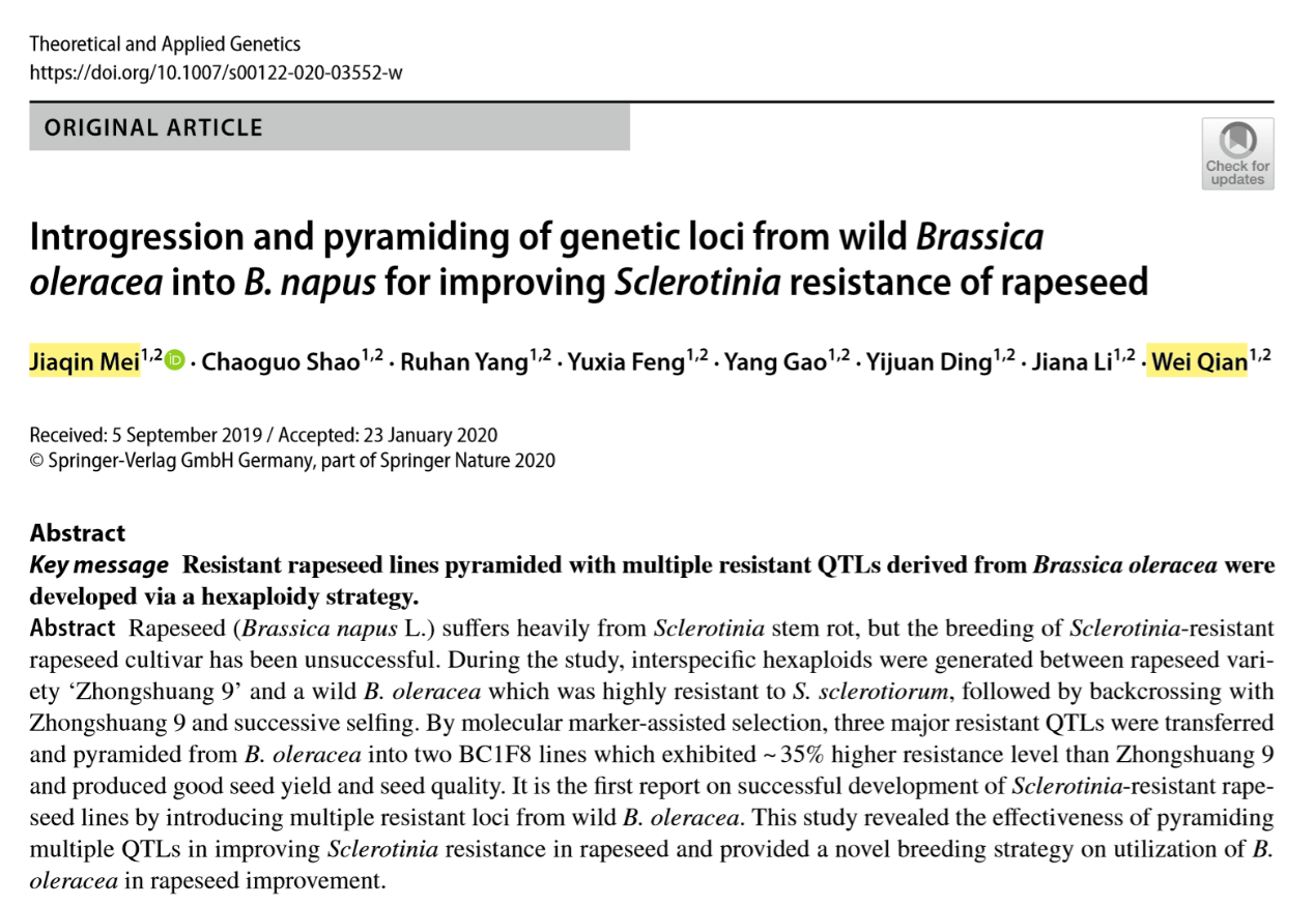 3、梅家琴教授以第一作者身份在农林领域权威期刊Theoretical and Applied Genetics(5-year Impact Factor为3.996)上发表论文《Introgression and pyramiding of genetic loci from wild Brassica oleracea into B. napus for improving Sclerotinia resistance of rapeseed》。研究首次利用野生甘蓝的多个菌核病抗性位点成功培育油菜菌核病抗性系。研究揭示了聚合多重QTL在提高油菜菌核抗性方面的有效性,为利用甘蓝改良油菜提供了一种新的育种策略。钱伟教授为论文通讯作者,西南大学为唯一完成单位。研究受到国家重点研发计划,国家自然科学基金,重庆市科委项目,中央高校基本科研业务费和重庆基础研究与前沿技术研究计划项目资助。