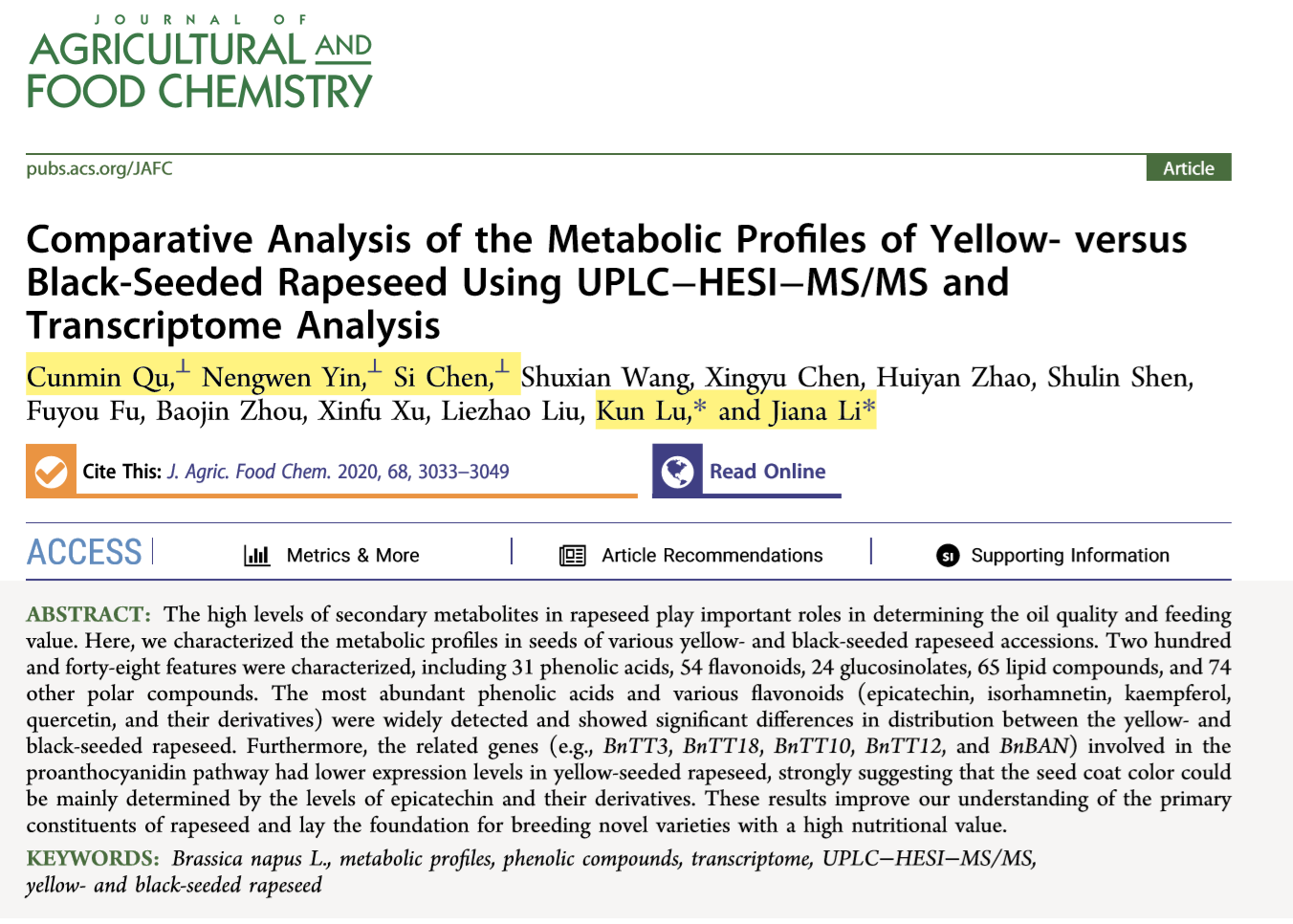 2、曲存民副教授以第一作者身份在农林领域权威期刊Journal of Agricultural and Food Chemistry(5-year Impact Factor为3.911)上发表论文《Comparative Analysis of the Metabolic Profiles of Yellow- versus Black-Seeded Rapeseed Using UPLC−HESI−MS/MS and Transcriptome Analysis》。研究鉴定了黑籽和黄籽油菜248种代谢组分,发现原花青素途径的相关基因在黄籽油菜籽中表达水平较低,说明籽粒颜色主要由表儿茶素及其衍生物的水平决定。结果为培育营养价值高的新品种奠定了基础。卢坤教授和李加纳教授为论文的共同通讯作者,西南大学为唯一完成单位。研究受到国家自然科学基金,重庆市自然科学基金和111项目资助。