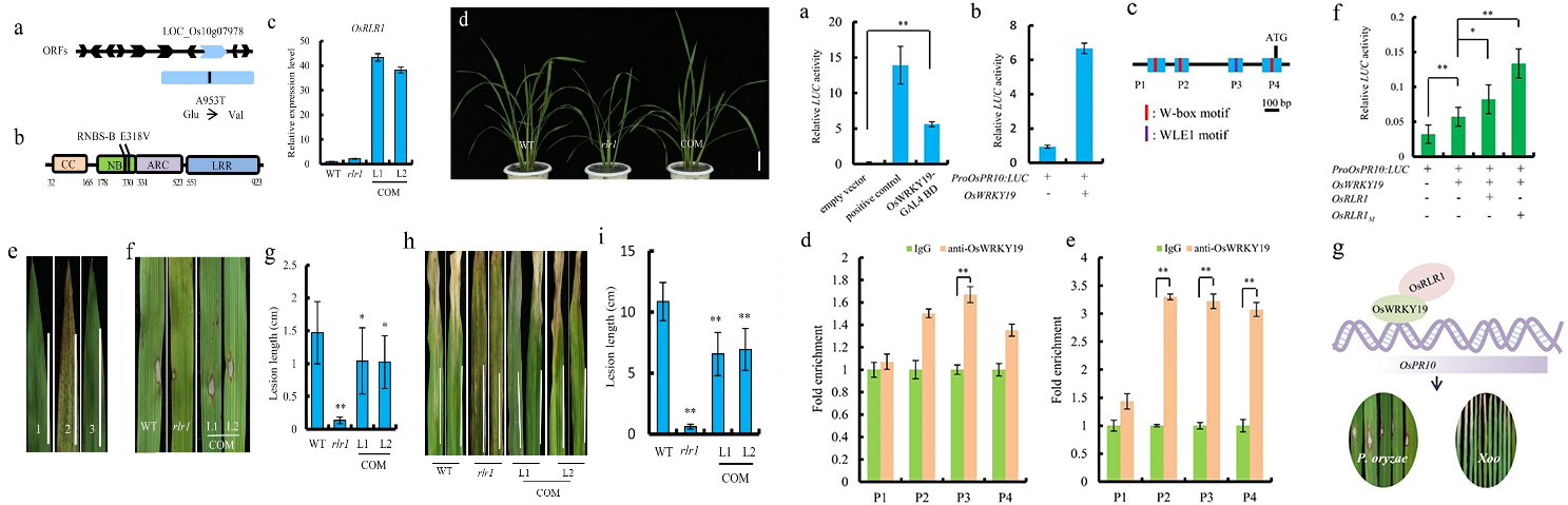 2020年12月,团队在顶级植物学期刊《Plant Biotechnology Journal》在线发表了“The CC-NB-LRR OsRLR1 mediates rice disease resistance through interaction with OsWRKY19”的研究论文,解析了NLR抗病蛋白OsRLR1与转录因子OsWRKY19相互作用并调控水稻免疫反应的分子机制。该研究通过EMS诱变籼稻品种缙恢10号,得到一个叶片表现出过敏反应症状(HR)的稳定遗传的突变体(rlr1),突变体叶片从苗期开始出现细胞死亡HR症状并伴随着叶片早衰现象,而对稻瘟病菌和白叶枯病菌的抗性显著增强。进一步通过图位克隆和基因功能验证发现目的基因OsRLR1编码一个CC-NB-LRR结构的NLR蛋白,该基因NB结构域保守模体RNBS-B附近的单碱基突变导致突变蛋白OsRLR1M的构象改变而活化,从而“开启”植物体免疫反应,出现HR症状。OsRLR1定位于细胞核,主要在水稻叶片表达,过量表达OsRLR1能够增强植株对稻瘟病和白叶枯病的抗性,且转基因植株并不会出现HR症状,而相关农艺性状与野生型水稻相比无显著差异。进一步发现OsRLR1在细胞核中与WRKY家族III型转录因子OsWRKY19相互作用而行使功能,而OsWRKY19具有转录激活活性,并且能够结合到病程相关基因OsPR10的启动子上激活其转录 (图4)。