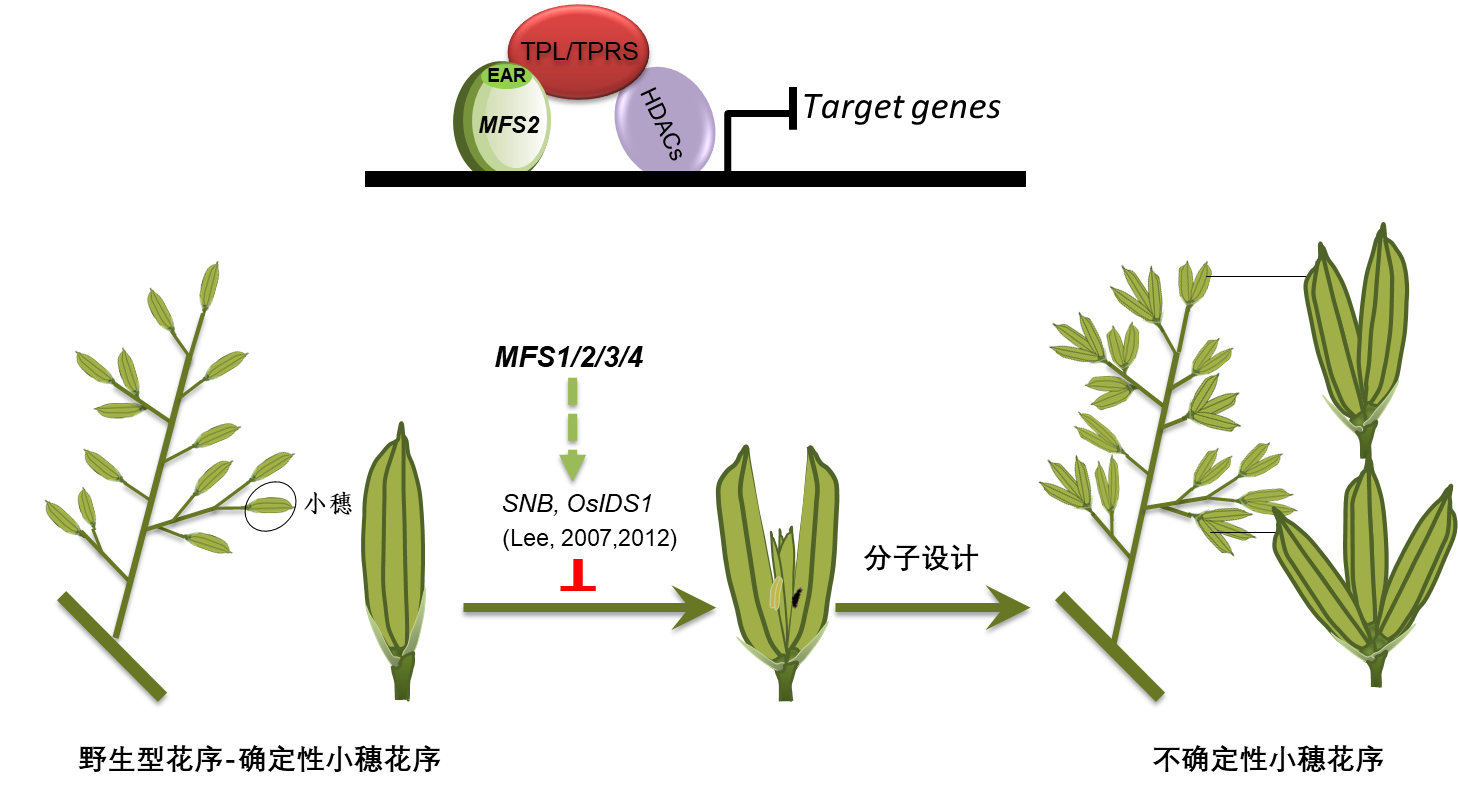 2020年7月和12月,团队分别在顶级植物学期刊《Plant Physiology》和农学重要期刊《Rice Science》上发文,解析了多花小穗基因MFS2、MFS4调控水稻小穗分生组织确定性的分子机制。在水稻中,花序分枝梗和小穗两种类型,小穗实为禾本科特有的花序结构,在不同物种中分为确定性小穗和不确定性小穗两类;在确定性小穗物种如水稻、玉米中,只能产生固定数目的小花/籽粒。在不确定性小穗物种中如小麦、二穗短柄草等,小穗最终产生的小花/籽粒数目是变化的,且一般都大于2个。理论上,如果能够将水稻确定性小穗定向改造成不确定性小穗,将实现“小穗内小花/籽粒数目”的倍增。最早前人的研究表明,水稻AP2-like基因SNB和OsIDS1参与了小穗分生组织确定性的调控,突变后发生一定比例的小穗内多小花情况。团队曾于2013、2019年鉴定了另外两个调控小穗分生组织确定性的基因MFS1和MFS3,分别发表在《Plant Physiology》和《JIA》上。2020年7月发表在《Plant Physiology》的MFS2编码一个MYB转录因子,具有明显的转录抑制活性,可以通过EAR基序和转录共抑制子TPRs结合,从而介导组蛋白修饰抑制下游基因,在小穗分生组织确定性调控中发挥作用;2020年11月发表在《Rice Science》的MFS4基因编码一个茉莉酸合成途径的一个脂肪酶,可能通过茉莉酸信号途径发挥作用。MFS1/2/3/4最终都影响了SNB和OsIDS1基因的表达(图2)。