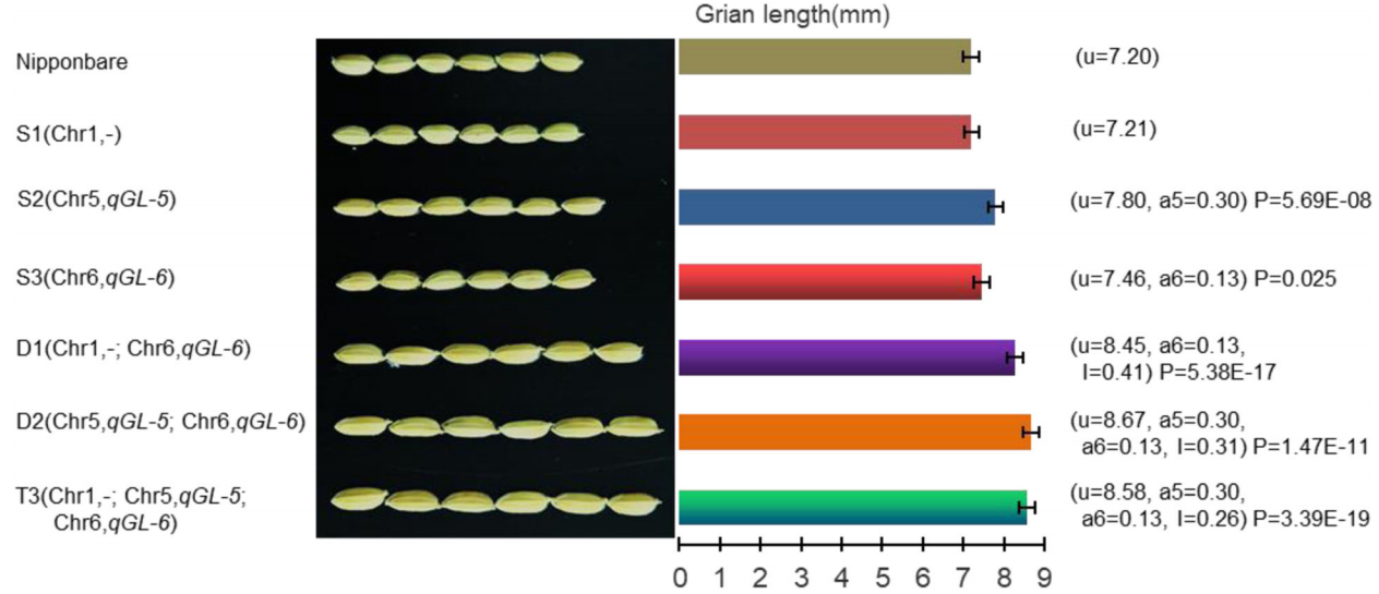 2020年6月,团队的一项QTL解析工作发表在农学一区期刊《Rice》上,本研究鉴定了一个日本晴为遗传背景的3片段长粒水稻染色体片段代换系Z1392。其长粒由2个来自西恢18的主效qGL5和qGL6控制。并培育了3个单片段代换系及2个双片段代换系。qGL5和qGL6聚合产生正向上位性效应,使D2产生了更长的籽粒,并精细定位qGL6,其候选基因为OSARF19。