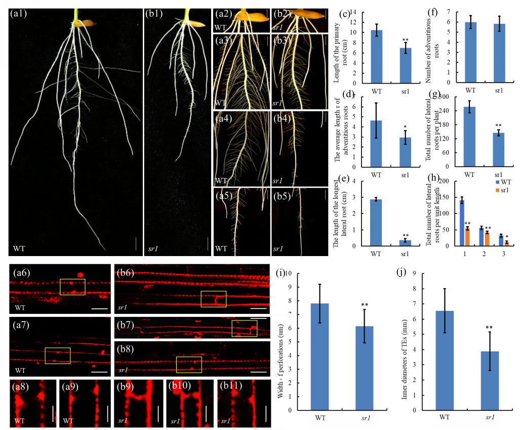 2020年11月,团队在顶级植物学期刊《The Plant Journal》发文,解析了水稻短根基因SR1调控根发育的分子机制。植物的根系对其生长和发育极为重要,是植物吸收养分和水分的主要器官。改善根部结构,提高水稻产量以及应对逆境(例如干旱,盐度增加和贫瘠)的能力对水稻植株非常重要。植物根部生长具有复杂的调控系统,水稻中已经描述了许多根发育缺陷及其相关基因。胞泌复合体是囊泡运输的关键因素,并参与真核生物的细胞分泌、细胞生长、细胞分裂等细胞学过程。最近的一些研究表明,胞泌复合体也参与调节根的发育,该团队通过基于图位克隆和遗传互补获得了短根突变基因SR1,其编码具有EXO70结构域的植物保守蛋白EXO70L2,仅在根分生组织和导管中表达。sr1突变使根部分生组织细胞增殖受损、细胞减少,导致根变短;同时相邻导管间穿孔受到影响,木质部发育异常。最终致使植株矮化、叶片水势和水分含量降低,叶片枯死(图2)。SR1的研究丰富了胞泌复合体参与水稻根发育的功能解析。