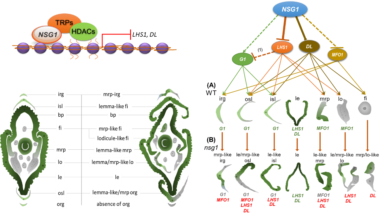 图1、NSG1基因调控小穗器官发育模型