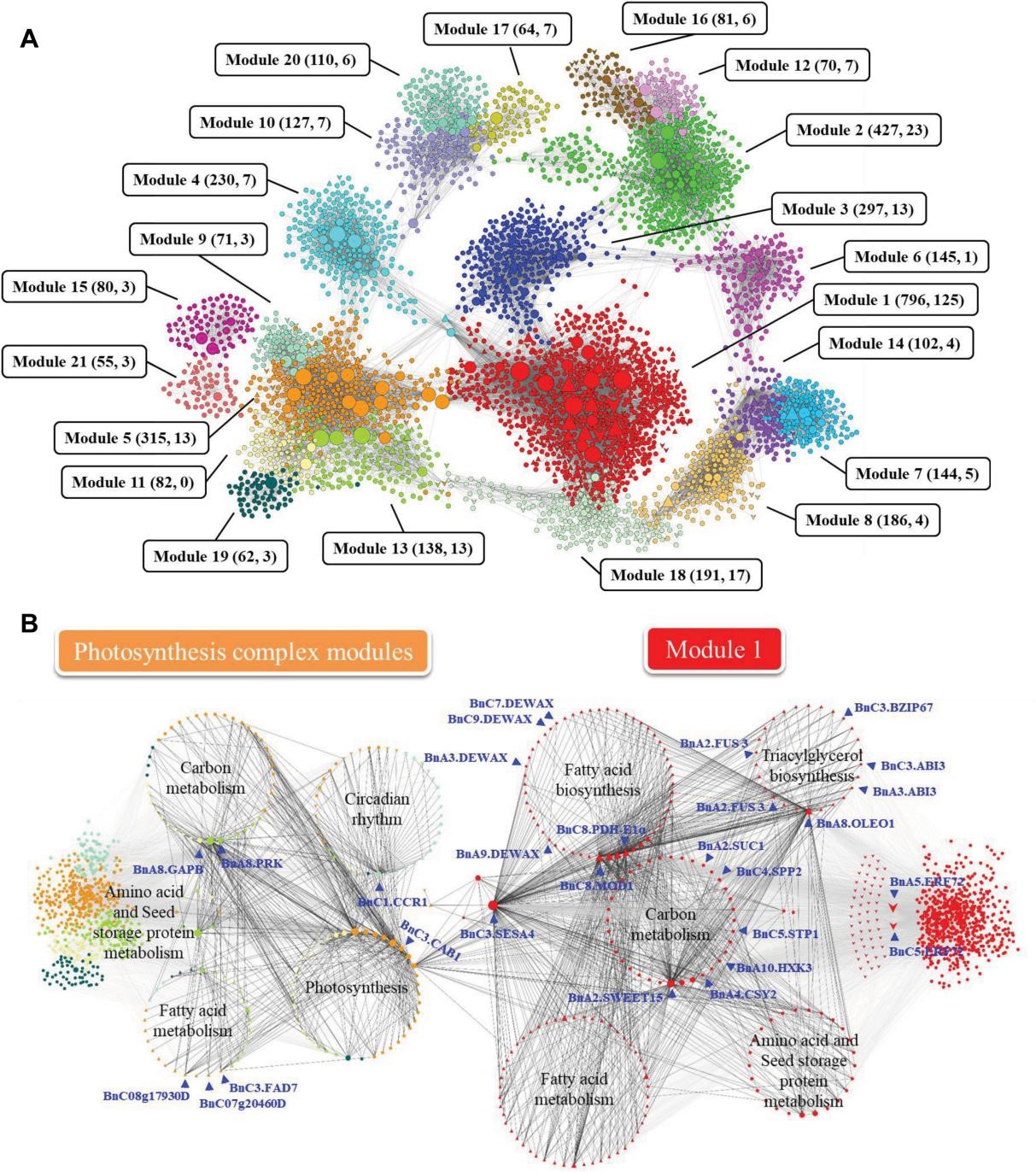 图3 油菜含油量基因共表达网络及核心模块