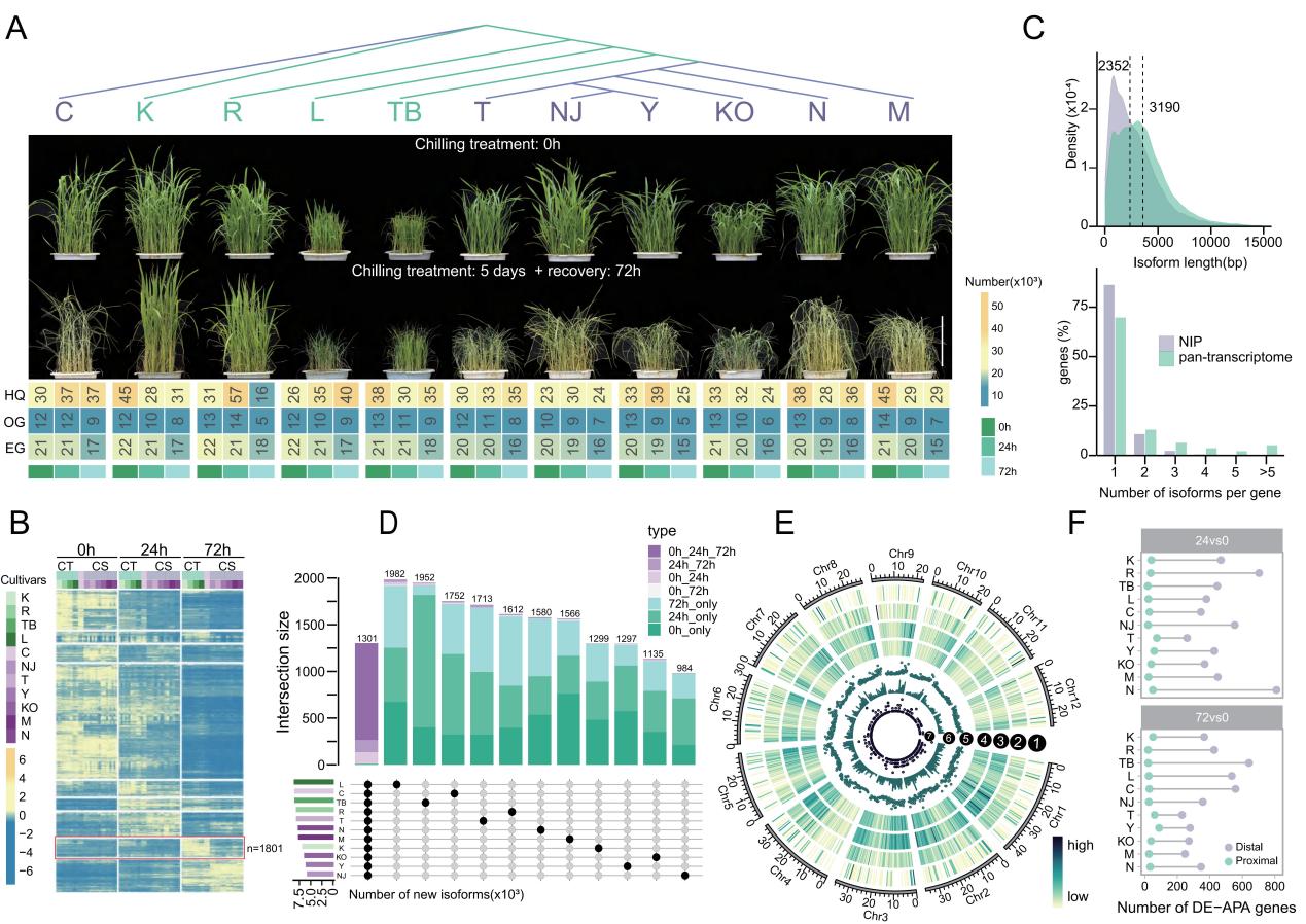 科研团队基于11种籼粳稻材料在冷胁迫下的转录组数据(Iso-Seq和RNA-Seq)构建了水稻泛转录组,表征不同水稻品种的冷响应转录调控景观,发现籼稻和粳稻的转录组在冷处理后期表现出明显的差异。进一步利用水稻冷胁迫泛转录组数据,构建了冷胁迫下水稻基因的共表达网络,确认了OsCATC和Os03g0701200两个基因可作为增强水稻耐寒性工程改良的新候选基因,同时发现低温触发了水稻大规模AS事件响应,AS是水稻应对冷胁迫的重要调控机制。