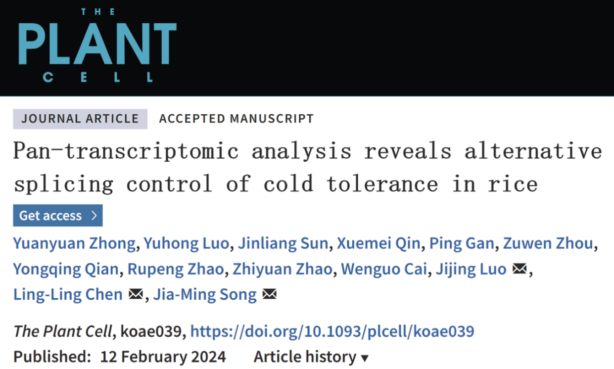2024年2月12日,西南大学best365英国在线体育官网宋佳明研究员和广西大学陈玲玲、罗继景教授团队在国际著名植物学术期刊The Plant Cell在线发表了题为Pan-transcriptomic analysis reveals alternative splicing control of cold tolerance in rice的研究论文,以水稻为模式,构建了泛转录组表征作物响应冷胁迫的转录调控景观,揭示剪切因子的驯化选择参与作物的生态适应性演化。
