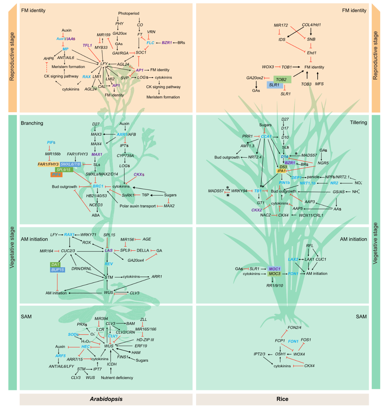 油菜角果数是复杂的数量性状,变异幅度大,易受环境因素影响。该研究整合了多个遗传群体定位结果,鉴定出174个角果数及相关性状的QTLs/QTNs,获得22个重要定位区间和240个调控油菜角果数候选基因,其中部分候选基因已在油菜中进行了功能验证,如BnaA02.AP1和BnaTFL1等。同时,总结了基因(如BnaA02.AP1、BnaTFL1、BnaA01.ERF114和BnaLAS)、激素(如生长素、细胞分裂素和独脚金内酯代谢途径关键基因BnaA03.IAA7、BnaA09.CKX2、BnaMAX1和BnaD14等)和环境因子(种植密度和营养供给)调控油菜分枝和花芽形成,增加单株角果数,提高油菜产量的机制。为进一步理解油菜角果数的调控机制。该研究对模式植物拟南芥和水稻茎尖分生组织生长发育、腋芽起始和伸长及花芽形成等生物学过程的调控机制进行了系统梳理,对AP1、TFL1、LAS、MAX1和D14等基因的分子机制进行总结;此外,还整理了调控拟南芥角果数形成关键转录因子WUS、AP1、LFY、STM、FLC、REV、SVP和SOC1的ChIP-seq结果,鉴定出包含146个角果数候选基因在内的13793个靶基因,以此构建了一个包含62个关键转录因子的基因调控网络,为油菜角果数和其他作物相关性状 的分子机制研究提供参考。