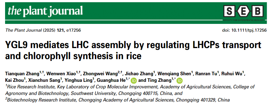近日,西南大学best365英国在线体育官网水稻团队在 The Plant Journal上发表了题为《YGL9 mediates LHC assembly by regulating LHCPs transport and chlorophyll synthesis in rice》的研究论文,解析水稻LHC组装的分子机制。
