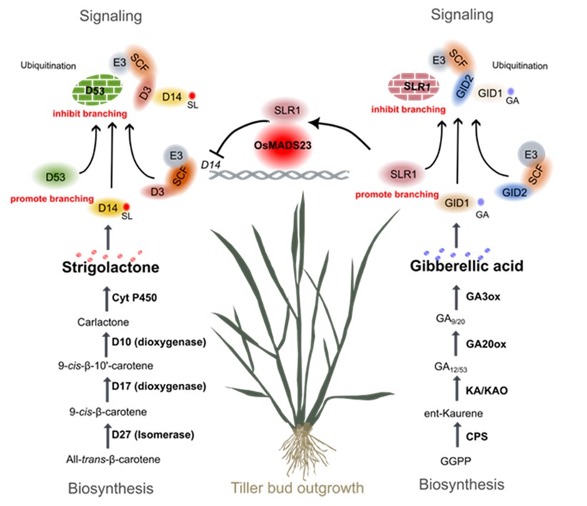 SLR1-OsMADS23-D14模块在调控水稻分蘖发育中的作用