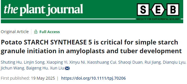 近日,西南大学薯类团队在植物学TOP期刊The Plant Journal上在线发表了题为“Potato STARCH SYNTHASE 5 is critical for simple starch granule initiation in amyloplasts and tuber development”的研究论文。