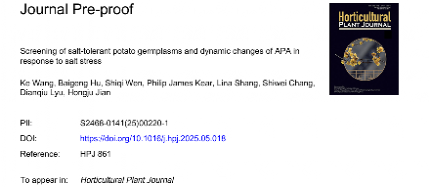 近日,西南大学薯类团队在Horticultural Plant Journal上在线发表了题为“Screening of Salt-tolerant Potato Germplasms and Dynamic Changes of APA in Response to Salt Stress”的研究论文,首次绘制马铃薯盐胁迫下的全基因组APA动态图谱。该研究深化了对马铃薯逆境响应机制的理解,为马铃薯耐盐遗传改良提供了新的分子靶点和理论依据。