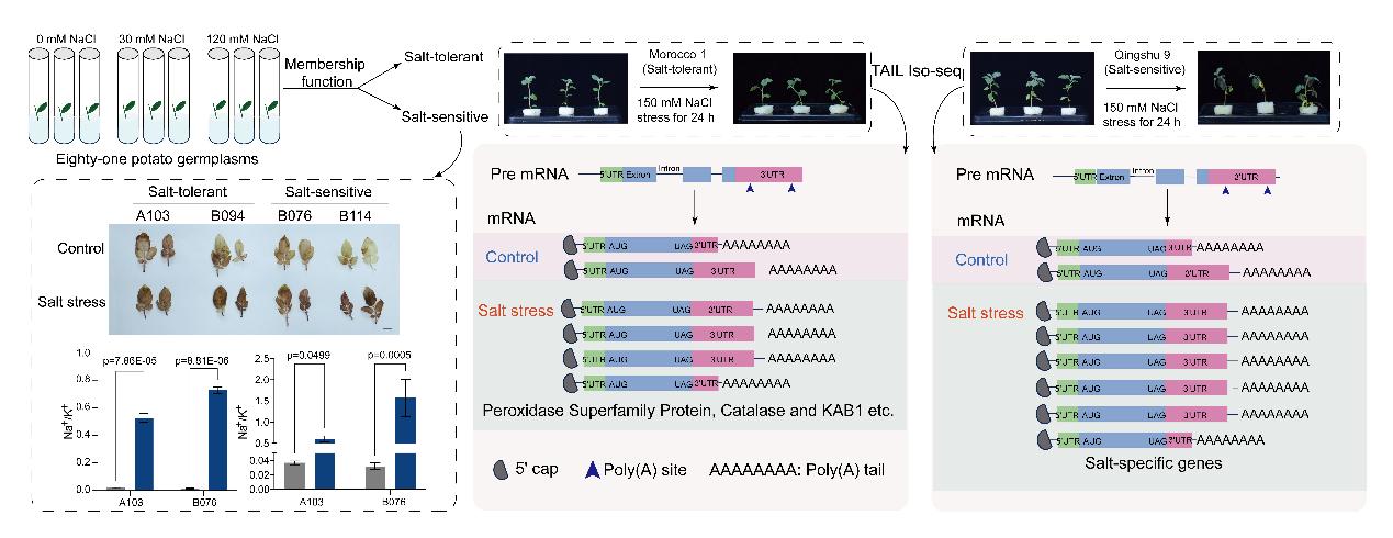 盐胁迫严重危害马铃薯的生长发育,然而可变多聚腺苷酸化(APA)在马铃薯盐胁迫响应中的调控机制尚未明确。该研究通过含NaCl的MS培养基胁迫处理,筛选出9份盐敏感型和7份耐盐型种质。进一步利用TAIL Iso-seq技术,全面解析了马铃薯在盐胁迫下的全基因组APA动态图谱,并鉴定到51,476个多聚腺苷酸化位点簇(PAC),涉及16,490个基因。耐盐种质与敏感种质在APA响应上存在根本差异:敏感材料响应剧烈但紊乱,而耐盐材料DE-APA基因数量较少,但精准富集于ROS清除、离子转运等关键通路,并通过使用远端poly(A)位点促使3' UTR延长,显著上调相关基因表达,从而增强耐盐性。研究筛选出NAC044、WRKY70等具有潜在功能的APA调控候选基因,为通过操纵APA过程培育抗逆作物品种开辟了新路径。