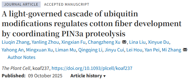 PIN-formed(PIN)蛋白介导的极性生长素运输在植物的光形态建成中发挥了重要的作用。然而,光信号如何精准调控PIN蛋白定位,一直是植物学领域的未解之谜。近日,西南大学best365英国在线体育官网张觅课题组在植物学权威期刊The Plant Cell上发表题为A light-governed cascade of ubiquitin modifications regulates cotton fiber development by coordinating PIN3a proteolysis的研究论文,揭示了光信号通过级联泛素化修饰控制PIN3a蛋白稳定性,调控棉花纤维发育的新机制。