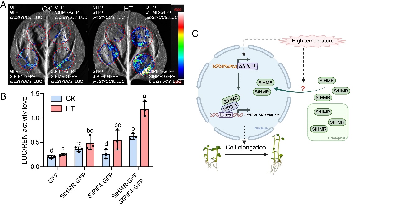 图5 在高温条件下,StHMR与StPIF4协同促进StYUC8的转录激活