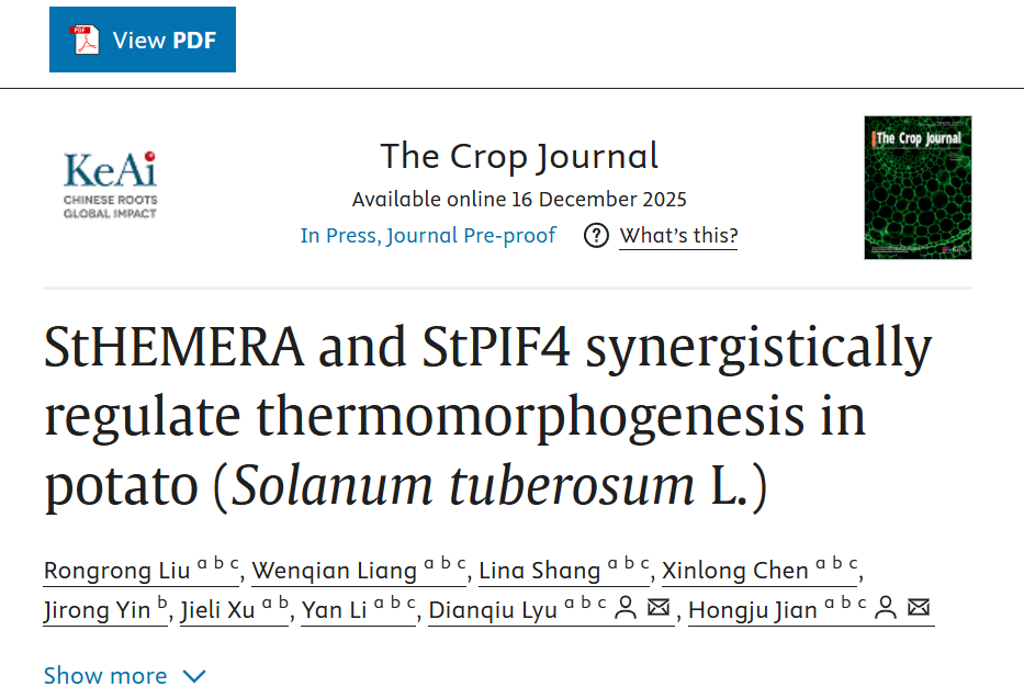 近日,西南大学薯类研究团队在The Crop Journal在线发表了题为“StHEMERA and StPIF4 synergistically regulate thermomorphogenesis in potato (Solanum tuberosum L.)”的研究论文,该研究首次鉴定出马铃薯中热响应型核-质体穿梭转录激活因子 StHEMERA(StHMR),揭示了 StHMR 与 StPIF4 形成调控模块协同调控马铃薯热形态建成的分子机制,为培育耐高温马铃薯品种提供了重要的分子靶点。