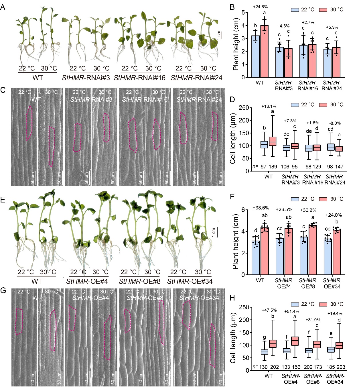 我们在马铃薯基因组中鉴定出一个核-质体双定位蛋白StHEMERA (StHMR)。功能分析表明,StHMR 是马铃薯热形态建成的关键调控因子。StHMR 沉默(RNAi)株系在高温条件下株高和茎表皮细胞长度几乎无显著增加,表现出高温不敏感表型;而 StHMR 过表达株系在高温下的株高和细胞伸长响应与野生型无显著差异(图2)。分子机制研究发现,StHMR 可与光敏色素相互作用因子 4(StPIF4)互作(图3)。功能验证显示,StPIF4 沉默株系在高温下的株高增加和细胞伸长显著受抑制(图4),证实其对马铃薯高温诱导的茎伸长至关重要。靶基因筛选和验证发现,StPIF4 可直接结合生长素合成基因StYUC8和细胞伸长基因StEXPA8启动子中的 E-box(CANNTG)顺式作用元件,激活这些基因的转录表达,进而调控马铃薯细胞伸长。StHMR作为转录共激活因子,显著增强StPIF4对StYUC8的转录激活能力,且这种增强效应在高温条件下更为显著(图5)。综上,该研究阐明了 StHMR-StPIF4 模块在马铃薯温度适应中的进化保守性与物种特异性,为通过分子育种改良马铃薯的高温适应性提供了重要的理论依据和候选基因资源。