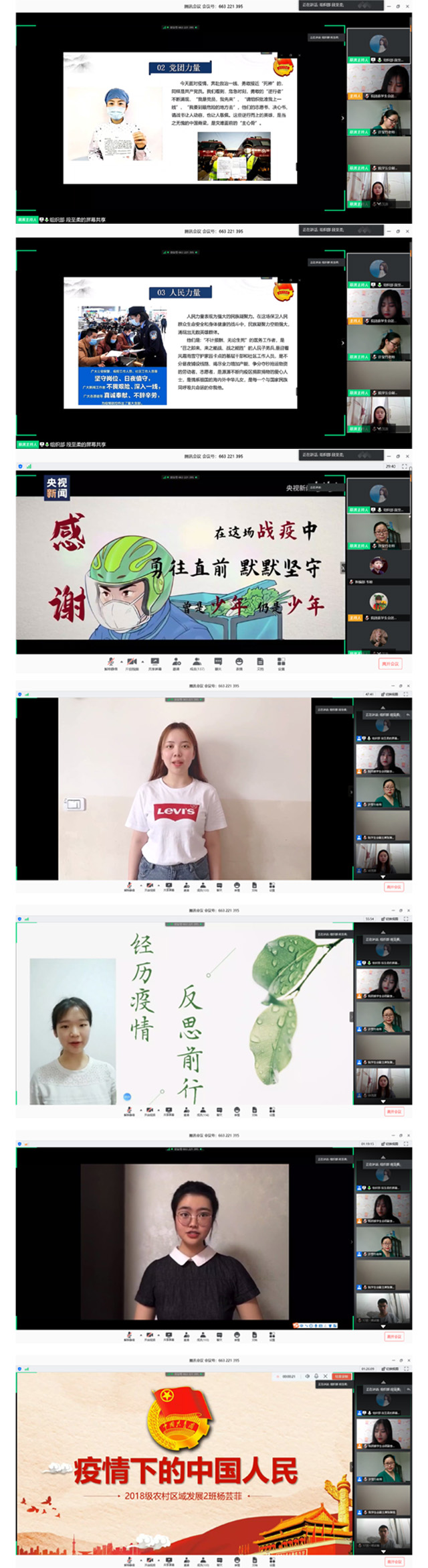本次比赛于5月8日上午10:30通过腾讯会议平台在线上举行,共有十名团校学员经过初赛评选进入此次决赛。学院团委书记许莹竹老师、校团委兼职团干徐茂源、院团委副书记李杨、团委学生会主席文诗琪、团委学生会副主席张琳悦和杨武魁等担任比赛评委,第七期团校培训班全体学员线上观摩学习,共同聆听由团校学员自己讲的战“疫”主题团课。