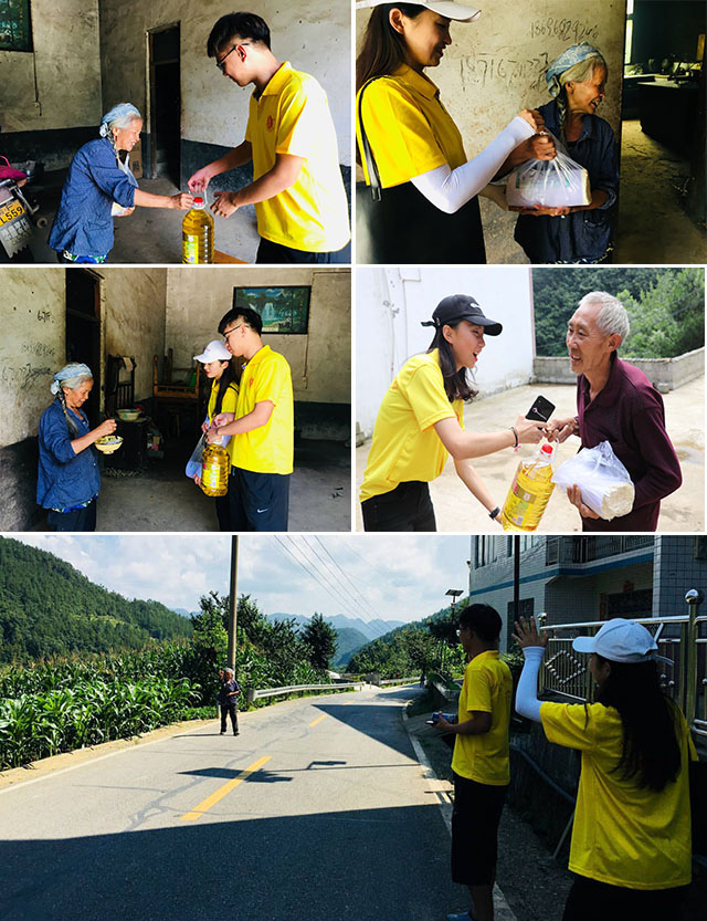 另一小组走访慰问困难户孤寡老人的活动也在同步进行。队员们提前买好了慰问物资,在村干部的带领下来到当地的两户非常困难的孤寡老人家里,将队员们购买的慰问品—米、面、油送给老人,并和老人们唠唠家常,为他们带去温暖、关怀、欢乐,也激励他们对生活的信心。离开之际,看着老人们脸上洋溢的笑容,队员们也恍然明白了此次任务的意义所在,也意识到了当前我国基层农村的脱贫攻坚工作的任务还相当艰巨。