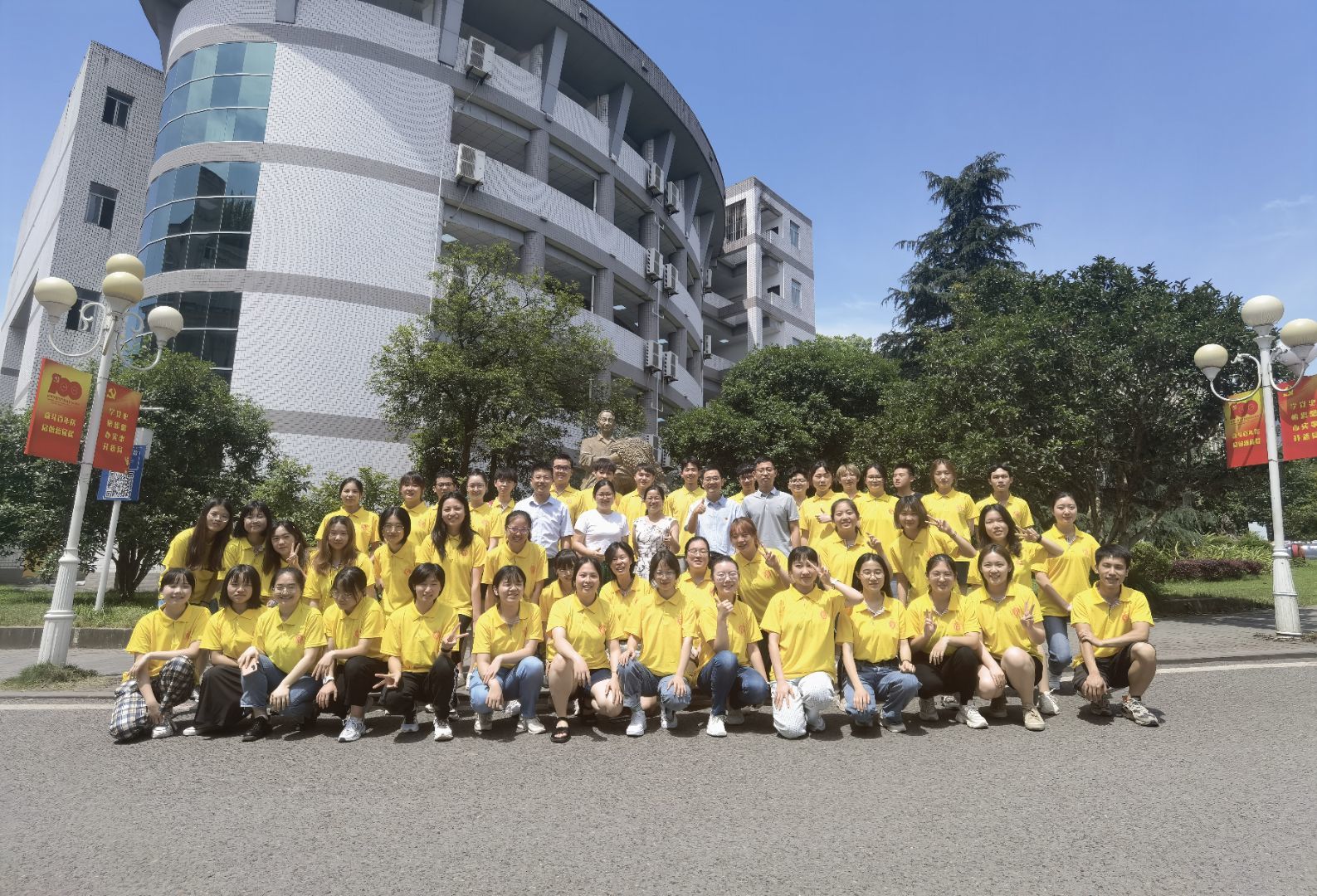 听完同学们热情洋溢的原创诗歌朗诵后,学院党委副书记郑莉佳老师作了点评讲话。她对参赛各团小组同学的认真准备、积极参与的态度给予高度评价,对同学们的原创诗歌作品和现场精彩表现大加赞赏,也对隆平拓展班团支部精心策划、有效实施的此次团日活动给予充分肯定。她也就团支部如何开展党史学习教育,如何开展好形式多样、丰富多彩、参与度高的主题团日活动进行了现在指导。活动后,老师和同学们在隆平雕像前合影留言。
