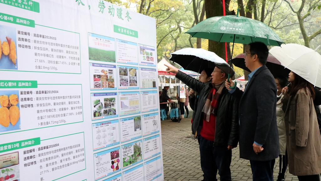11月21日,学院师生在校内南区樟树林进行甘薯科普知识宣传及专业学生生产实践劳动场景照片展,参与答题的同学可以免费领取烤好的红薯。即便下着大雨,香喷喷的红薯依旧吸引了不少同学前来围观。11月22日,教务处、学院与后勤集团膳食中心衔接,在全校学校7个学生食堂和2个教工食堂开设专门的免费品尝窗口,分别于早餐、午餐和晚餐时段,将同学们收获的三个品种约2000斤甘薯蒸熟免费供全校师生品尝。早上7点多,西南大学王进军副校长专门到禾丰楼食堂品尝同学们种植的甘薯并对活动给予高度评价。此次活动,也是学生们结合自身专业知识开展劳动教育、进行科普宣传的有利时机。对于同学们来说,既掌握了知识,也体会了劳动的快乐,更收获了认可与赞赏,大大提升了专业认同感,激发了农科学子的责任感和使命感。