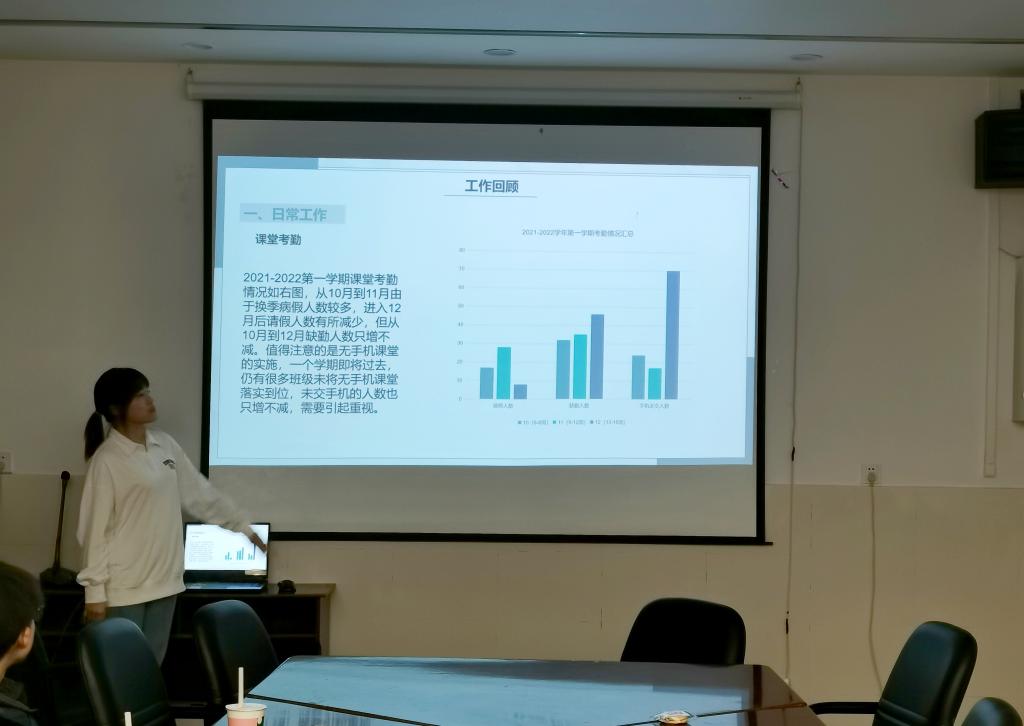 首先,各部门负责人围绕思想引领、成才服务、权益维护、自身建设、对外宣传等方面,依次进行工作述职。述职汇报以PPT展示和演讲的形式进行,既有对工作特色亮点的展示,也有对工作不足深刻总结和下一步工作打算的谋划。体育部在本学期完成了新生运动会、羽毛球联赛、“太阳杯”排球联赛以及“新生杯”篮球联赛中负责选拔、训练等重要工作。学科部在课堂考勤、辩论赛举行、学术论文大赛、笔记评选大赛、“学霸说”栏目建设等工作中取得了一定成效。宣传部负责学生会官Q和公众号的运营以及各活动的宣传,对新闻报道时效性不足等问题进行了反思。组织部在本学期完成了团组织关系转接、“青年大学习”的督促、各团支部“每周一学”活动开展和第九期团校培训班的举办等工作。就业创业部举办了简历大赛和完成了各大创新创业赛事的组织动员工作。办公室在物资管理、财务报账、内部枢纽、对外联络方面为各项活动开展提供了后勤保障。文娱部牵头完成了“植沐风雨 盛世芳华”2021年西南大学农学部迎新晚会的策划、组织等工作,以独特的方式为观众献上了一场视听盛宴。志愿者工作部举办了迎新志愿服务、“耕读园”“爱驻夕阳”“志愿者嘉年华”等多项志愿活动,服务学校与社会,发扬志愿者精神。社会实践部认真总结暑期三下乡社会实践活动,形成相关成果,申报各类奖项并启动筹备寒假学生分散实践,举办公务员模拟考试等活动链接各类社会资源为学院同学提供服务。团委书记许莹竹老师依次对各部门的总结述职做出点评,充分肯定了大家的工作成绩,针对各部门的工作性质、工作不足提出了相应的改进意见,并列举了许多值得大家学习的其他高校、院系的精品活动、宣传栏目等。许老师强调,各位同学要在履职尽责中服务同学,锻炼自我,把自己培养成为政治素质过硬、眼光开阔、思维活跃、执行力强、服务意识好、语言文字表达能力突出、责任心强的优秀学生骨干。