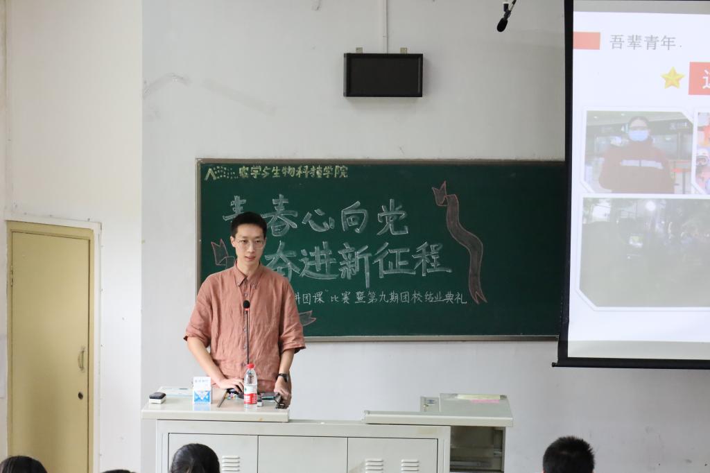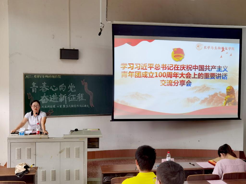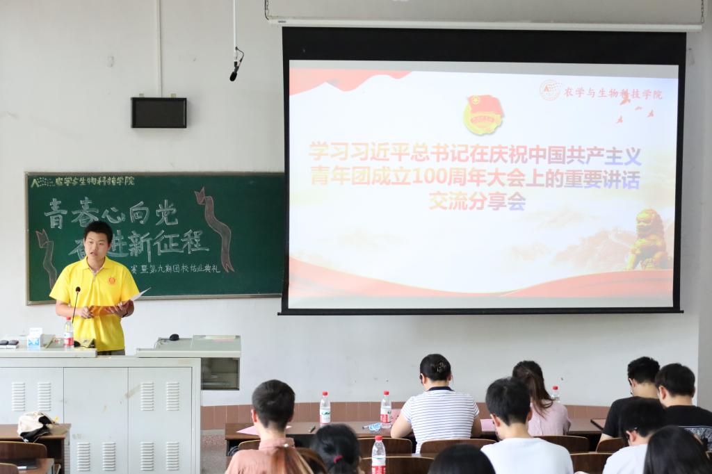 在团校结业典礼上,同学们还一同学习了《焦点访谈》专题视频《奋斗者 正青春 培根铸魂肩使命》,回顾了习近平总书记对广大青年的殷殷嘱托,同学们感悟到作为当代青年要树立社会主义核心价值观,要勤学习、明大德、立大志,才能成大才、担大任。青春由磨砺而出彩,人生因奋斗而升华。开展了学习习近平总书记在庆祝中国共产主义青年团成立100周年大会上的重要讲话精神学习交流会,师生们分享了自己的学习感悟。团委书记助理陶家阳说道,中国青年应当志存高远,有坚定的理想信念和清晰的思辨精神,这样才能在理想和现实、主义和问题、小我和大我、民族和世界等问题上做出正确的抉择和判断。2021级团员王媛媛也从自身学习、工作分享了习近平总书记的讲话带给她的启发和思考,作为农生学子,要以强农兴农为己任,瞄准国家战略需求,厚植“知农爱农”情怀,敢做农业现代化的领跑者,为国家的“三农”事业贡献青春力量,不负时代,不负党的引领号召,践行青年团员的使命担当。习近平总书记在讲话中提出“实现中国梦是一场历史接力赛,当代青年要在实现民族复兴的赛道上奋勇争先”,许莹竹老师勉励同学们说,在人生中会我们会进入到不同的赛道,要在每个赛道上的每个环节都不懈努力,要有理想、敢担当、能吃苦、肯奋斗,用青春的量为党和人民的事业做贡献。许老师还结合学院老师们的先进事迹,鼓舞农科学子们要在青春的赛道上跑出最好的成绩!
