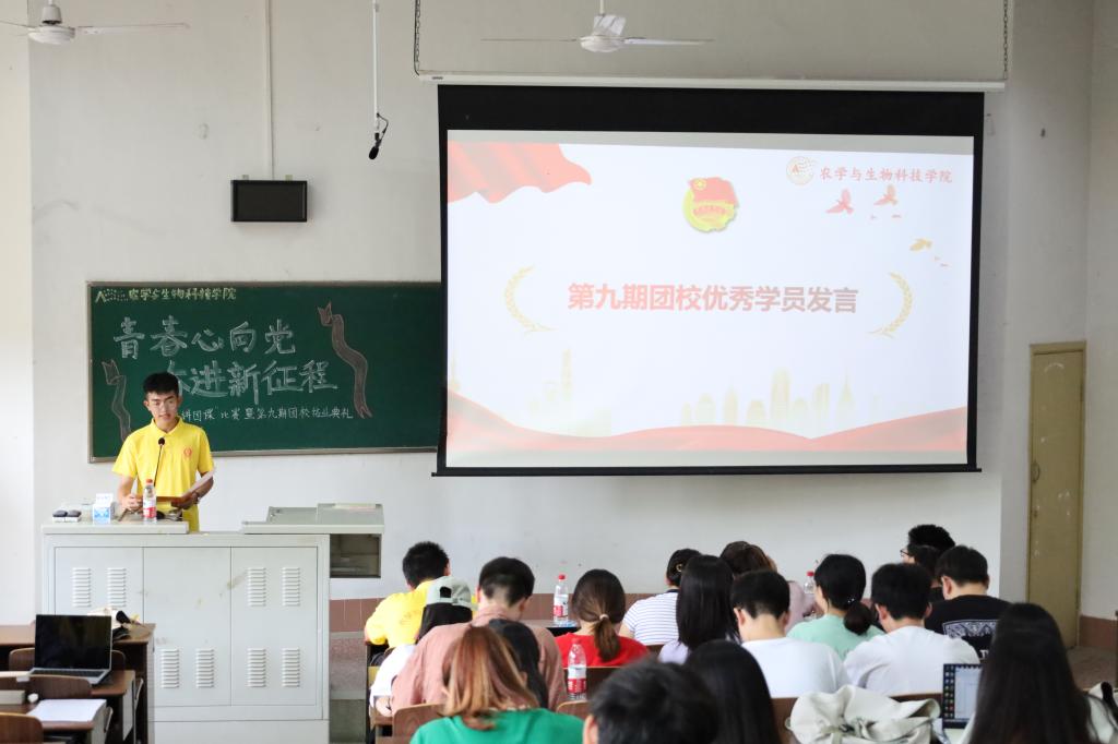 本期团校于2021年11月开班,课程内容丰富,形式多样,涵盖了新闻写作和策划能力培训,团学骨干核心素养提升,创新创业知识讲座,奥运精神、红色精神等诸多方面。学员们认真学习、收获良多,沈益冰等共15名同学被评为“优秀学员”。来自2021级植物生产类三班的李济聪同学作为“优秀学员”代表上台发言,表示经过团校长期丰富的培训学习,自己受益匪浅,不仅思想上得到了提高,心理上更获得了充实与满足,接下来将继续不忘初心,牢记使命,为共产主义事业不懈奋斗,为青春谱写无悔的赞歌