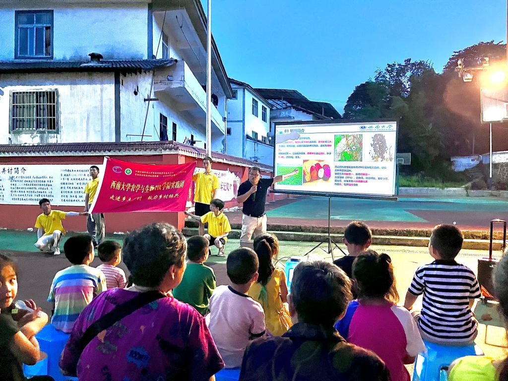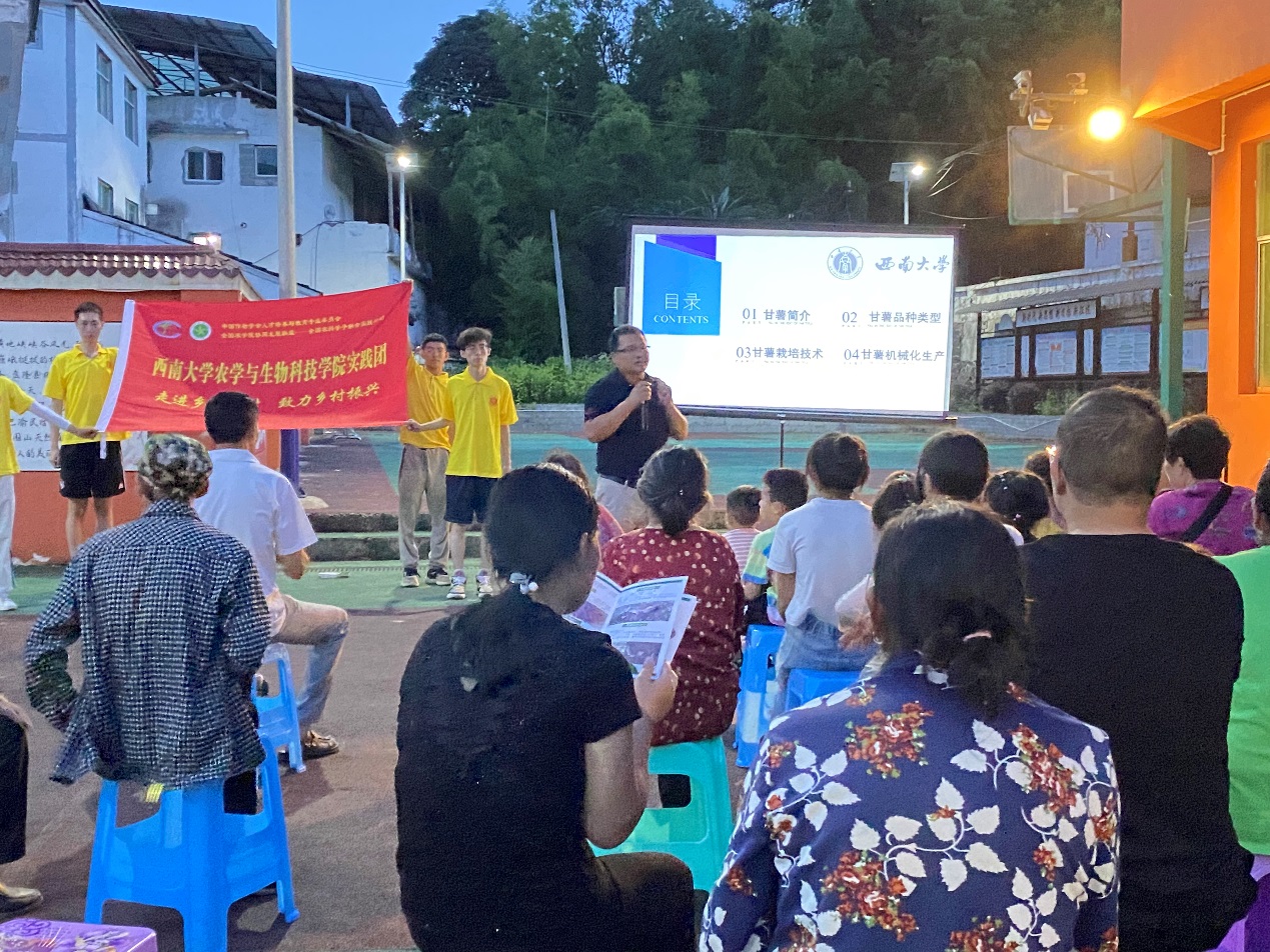 为帮助基层农户提高生产种植技术,助力当地产业振兴,7月10日晚上8点,实践队在润溪乡樱桃井村村委会广场举办了一场以“甘薯新品种、新技术、机械化种植”为主题的专题培训讲座,邀请学院甘薯育种专家唐道彬老师为当地种植农户详细讲解甘薯的新品种及种植技术、机械化种植技术、储藏技术。